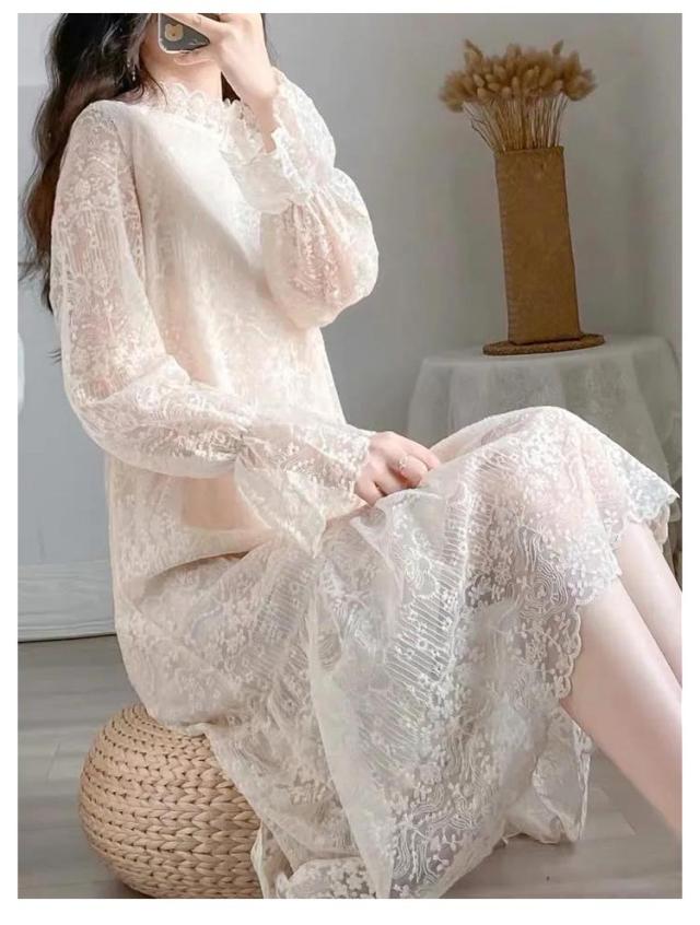 ドレス フリル 総レース レディース ロング 透け感 立ち襟 スタンドカラー ハイウエスト 長袖 ボリューム袖 カジュアル パーティードレス 着痩せ 体型カバー オフィス 通勤 ロング パーティー 結婚式 送料無料