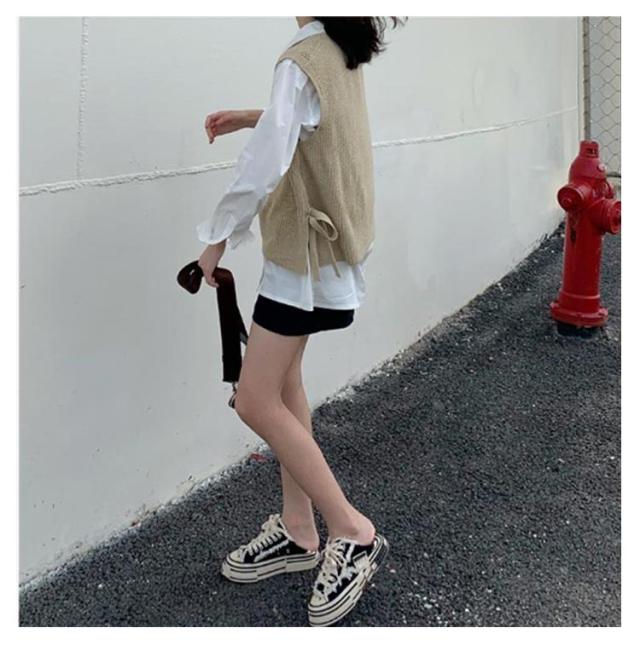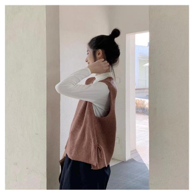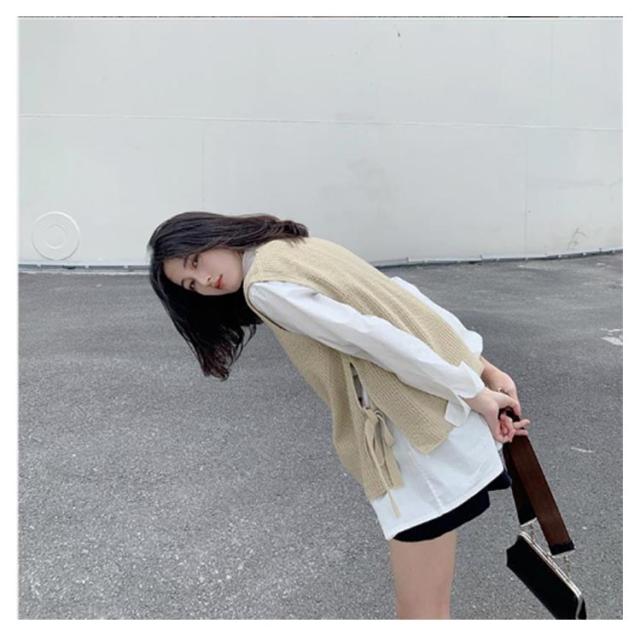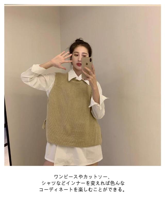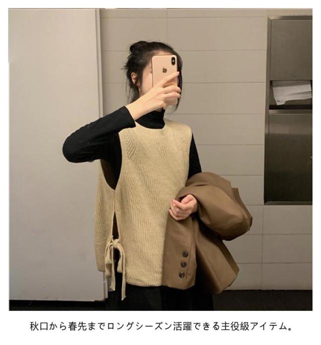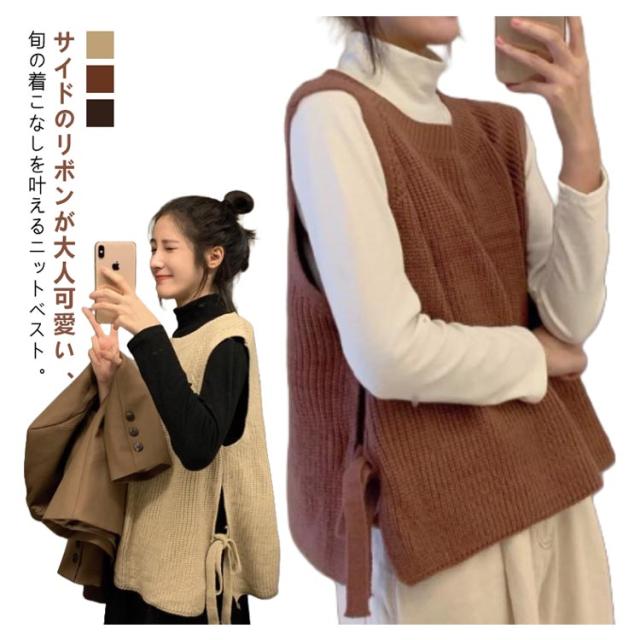 丸首 サイドリボン あぜ編み ニット ベスト レディース レイヤード ベスト ショート丈 クルーネック 重ね着 ジレ サイドリボン スリット 秋冬 ニットベスト プルオーバー ノースリーブ セーター 送料無料