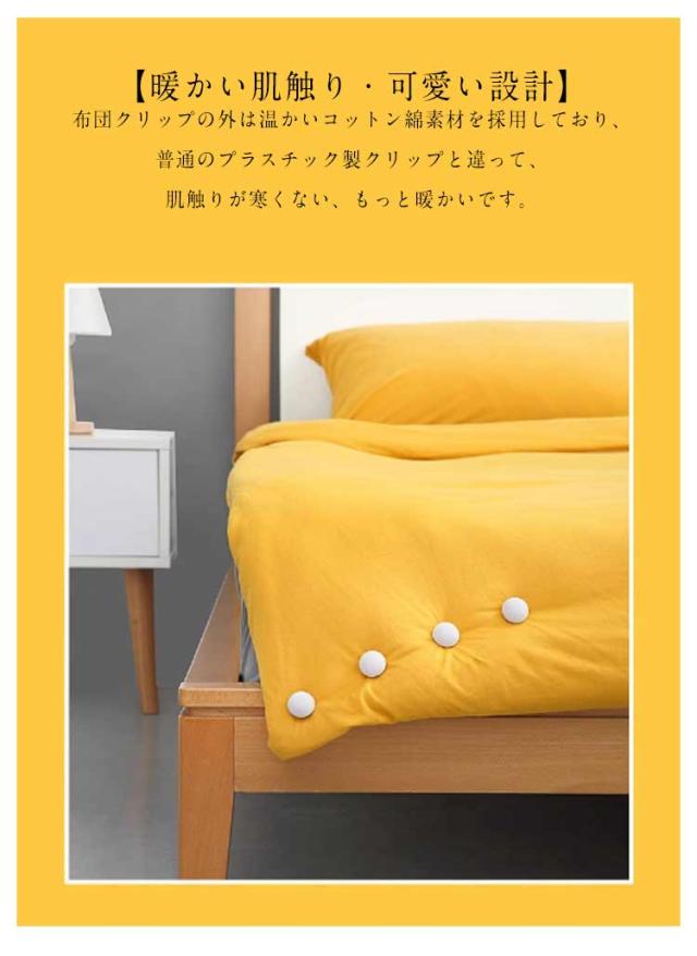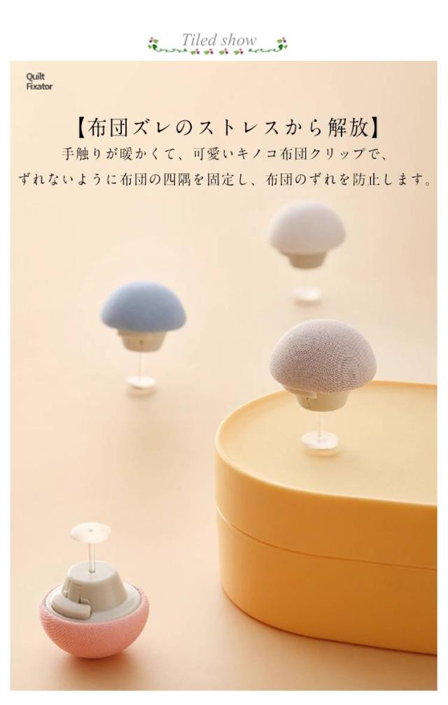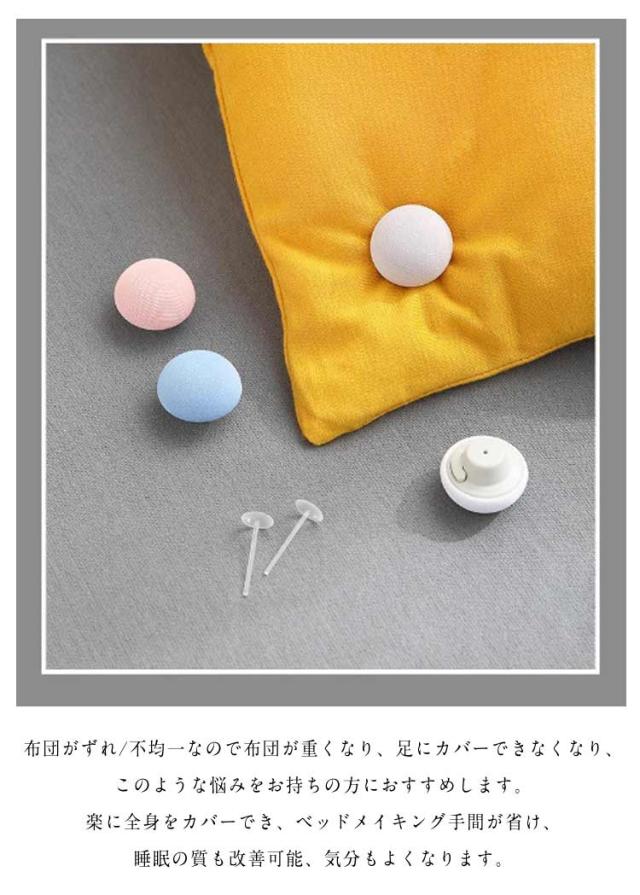 | 【布団ズレのストレスから解放】手触りが暖かくて、可愛いキノコ布団クリップで、ずれないように布団の四隅を固定し、布団のずれを防止します。布団がずれ/不均一なので布団が重くなり、足にカバーできなくなり、このような悩みをお持ちの方におすすめします。楽に全身をカバーでき、ベッドメイキング手間が省け、睡眠の質も改善可能、気分もよくなります。 【暖かい肌触り・可愛い設計】布団クリップの外は温かいコットン綿素材を採用しており、普通のプラスチック製クリップと違って、肌触りが寒くない、もっと暖かいです。春秋冬季節に適しています。シンプル「きのこ」のデザインで可愛くおしゃれです。ピンク、ホワイト、ブルー、グレー、四つの色があります。自分のシーツによって選択でき、好きなように組み合わせることもできます。 【高品質素材・安定ボタン設計】ボタン設計でもっと安定で、布団をしっかりと固め、クリップが外れる心配はありません。伝統的な鋭い金属針を変え、固定用の釘は高品質シリコンPET素材を使用しており、軽量で堅固、耐久性も優されて、ちくちくしなくで、傷を防ぐことができます。もっと安全で、子供にも適用されます。 【嬉しい予備シリコン針付属】24個組にシリコン針は45本付属で、もっと長くお使いいただけるのが嬉しいポイント。 【幅広い用途】布団の固定用だけでなく、カーテンの固定、タオル、靴下の保管など、様々な用途にお使いいただけます。 | |