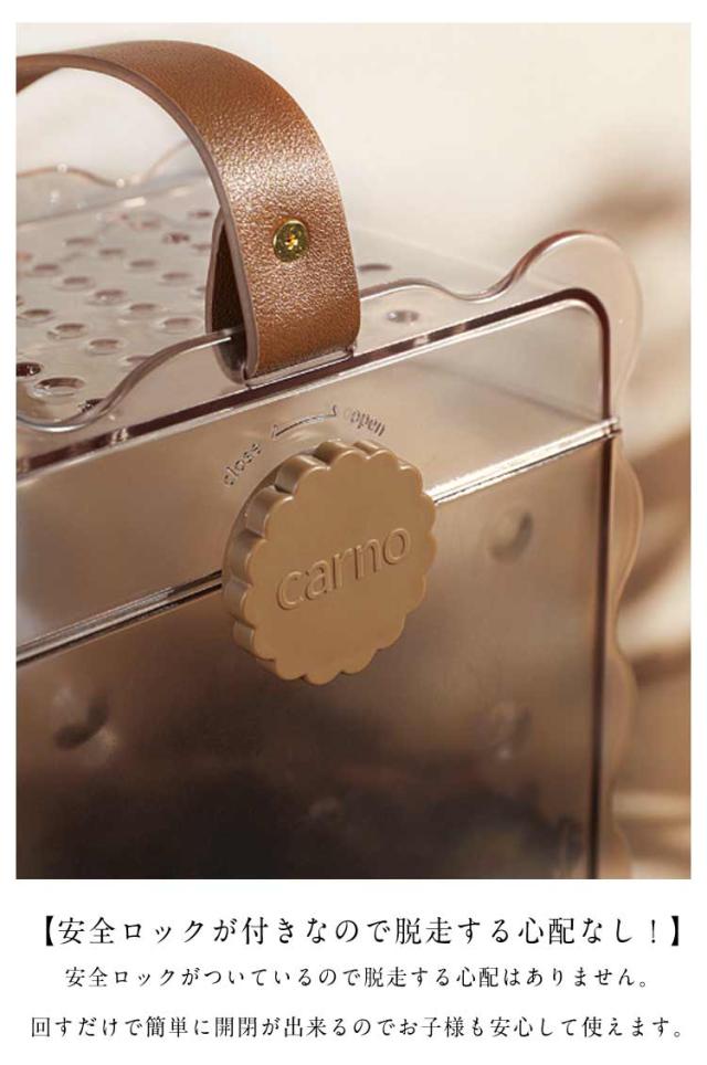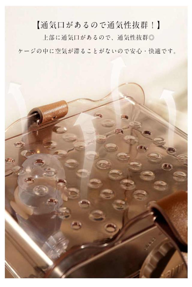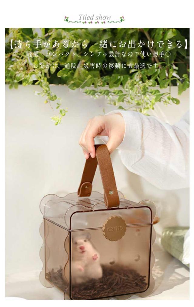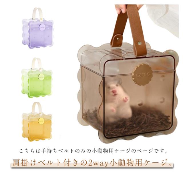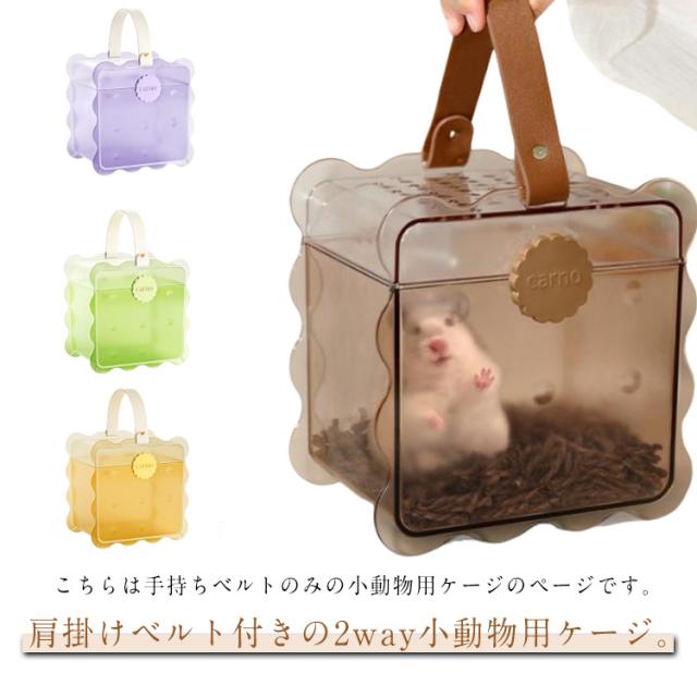 | こちらは手持ちベルトのみの小動物用ケージのページです。 肩掛けベルト付きの2way小動物用ケージ。 【持ち手があるから一緒にお出かけできる】 軽量・コンパクト、シンプル設計なので使い勝手〇 おでかけ、通院、災害時の移動にも最適です。 【クリア素材なのでいつでも様子が見れる!】 側面はクリア素材なので、いつでも様子を見ることができ安心です。 前面と背面はマット加工しているのでプライバシーを守ります。 【蓋が大きく開くのでふれあいやすい!】 蓋が大きく開くので、いつでもどこでもペットに餌やりや触れ合うことが出来ます。 【給水ボトル付きだからおでかけも安心!】 給水ボトル付きなので、長時間のお出かけも安心です。 【通気口があるので通気性抜群!】 上部に通気口があるので、通気性抜群◎ ケージの中に空気が滞ることがないので安心・快適です。 【安全ロックが付きなので脱走する心配なし!】 安全ロックがついているので脱走する心配はありません。 回すだけで簡単に開閉が出来るのでお子様も安心して使えます。 【シンプルなデザインなのでお手入れが簡単!】 シンプルなデザイン、蓋が大きく開くので掃除がラクチン! 清潔な状態を保つことが出来ます。 | |