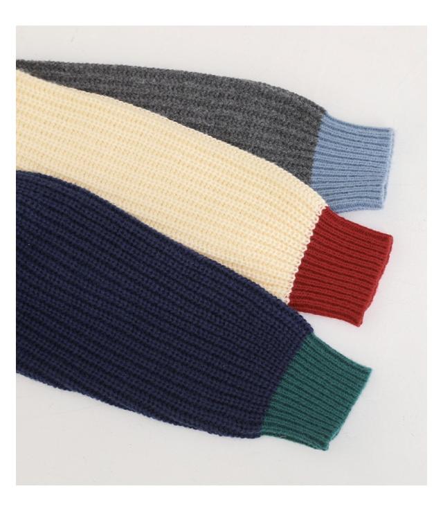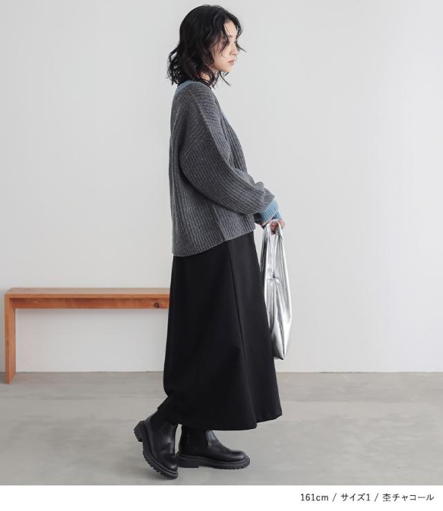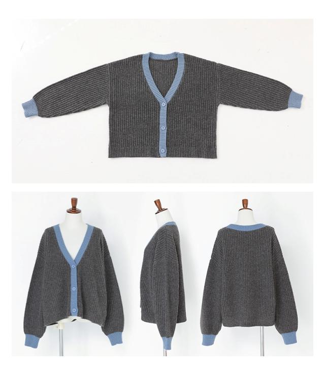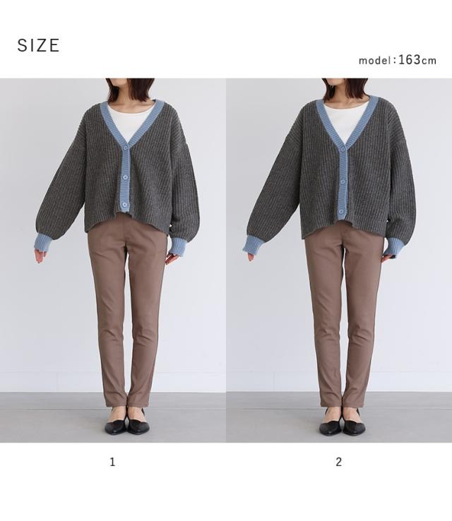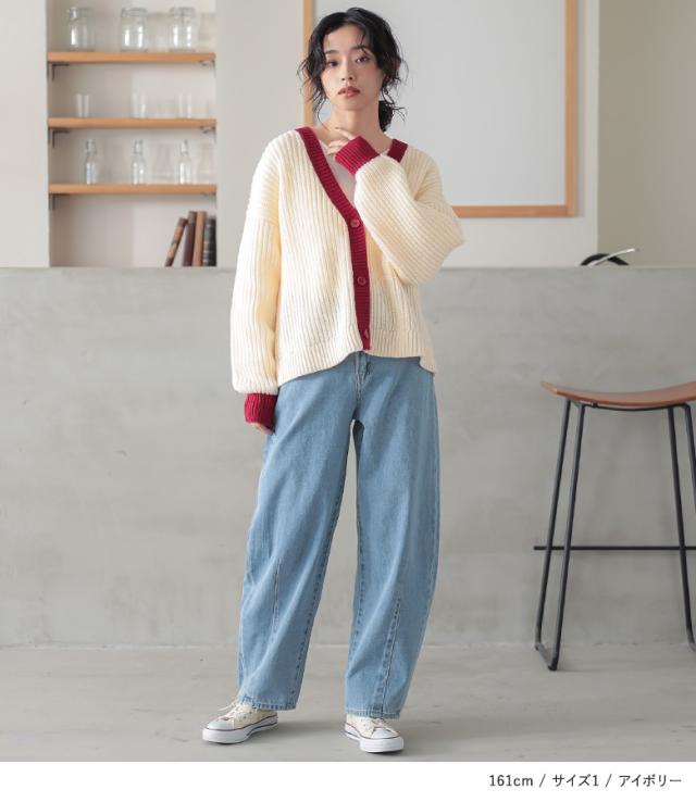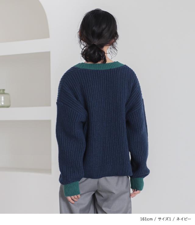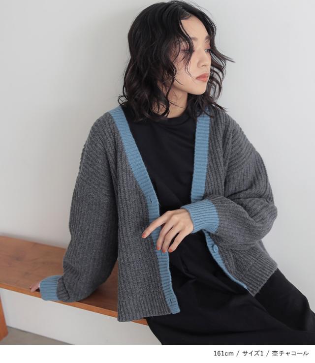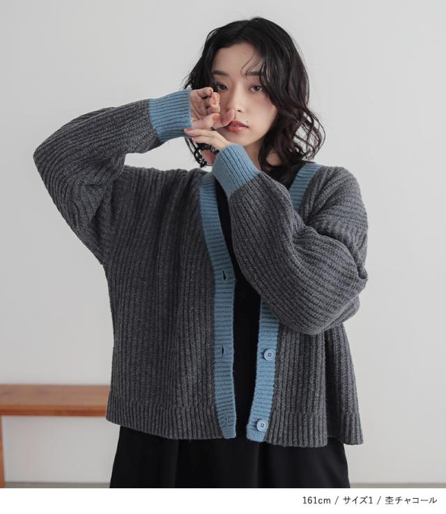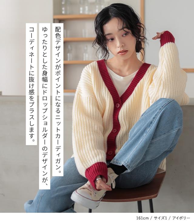 『配色片畦編みニットカーディガン』【メール便不可】【30】[ニット カーディガン 長袖 レディース トップス セーター ニットカーディガン 羽織 配色 片畦編み ゆったり ショート丈 ドロップショルダー]