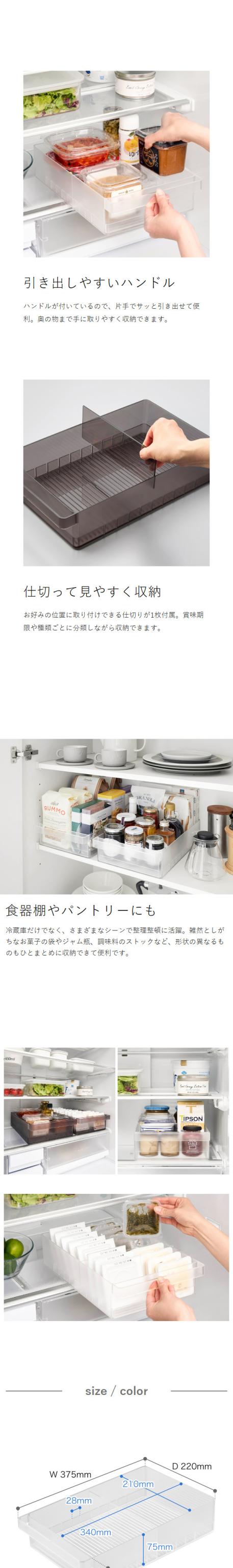 冷蔵庫の奥まで無駄なく使えるワイドなストッカー。味噌や漬物などのパックもまとめて収納できる大きめサイズです。納豆や豆腐のパックを立てて並べれば、賞味期限の確認もラクラク。