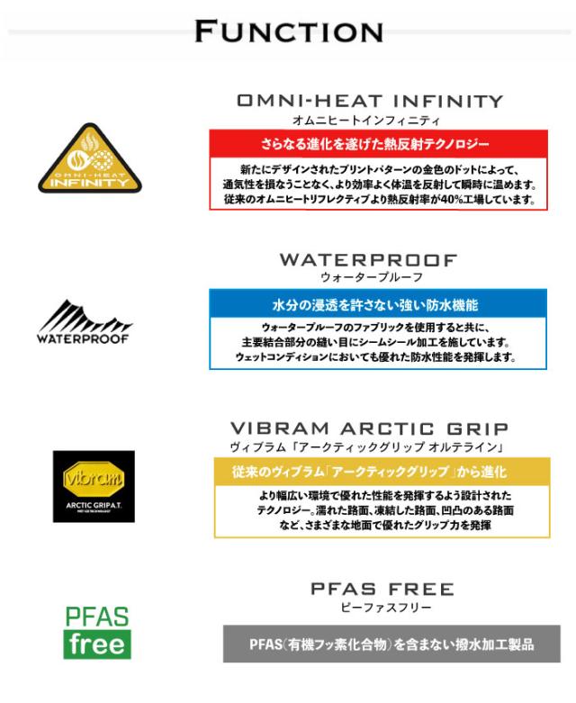 全天候型のウォータープルーフ仕様に加えて、ライナーには熱反射保温機能「オムニヒートインフィニティ」を搭載しており、ゴールドの裏地が体の熱を反射するため、真冬の寒い日でもシューズ内を暖かく保ちます。