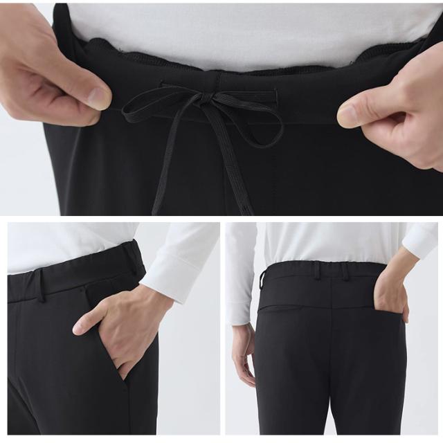 ウエストゴム部分は調整紐付きの前開き仕様で、ビジネス対応に必須なベルトループ付き。