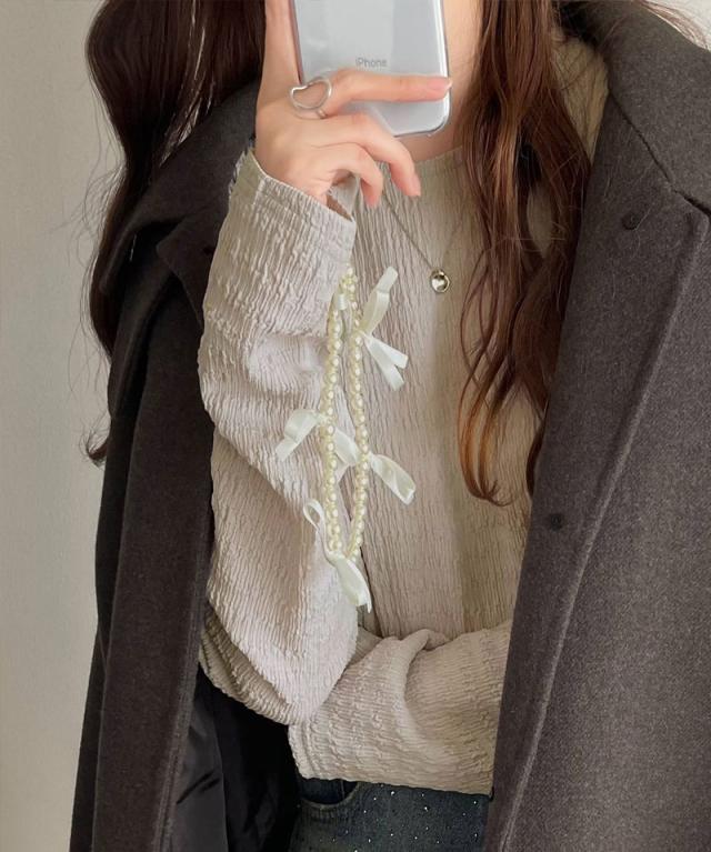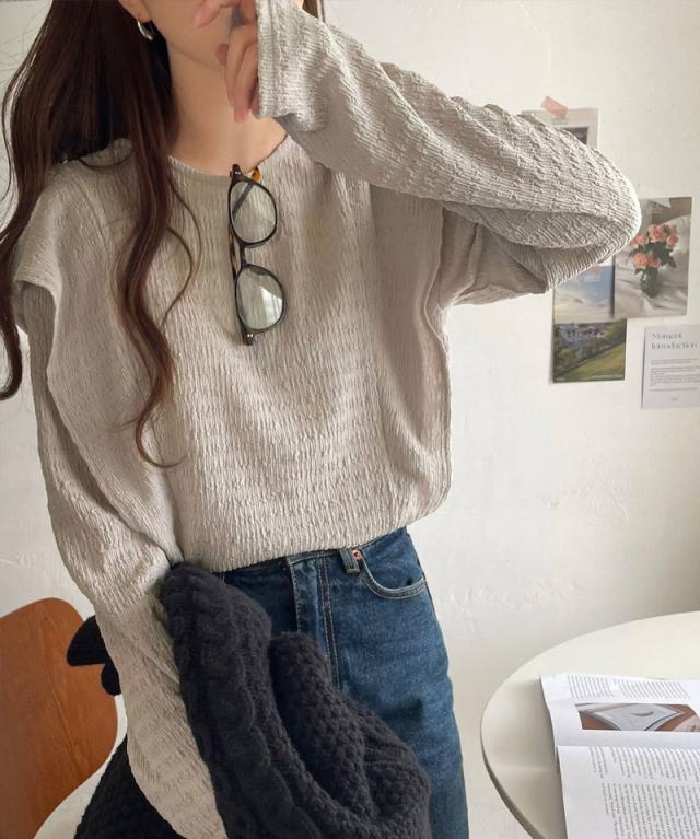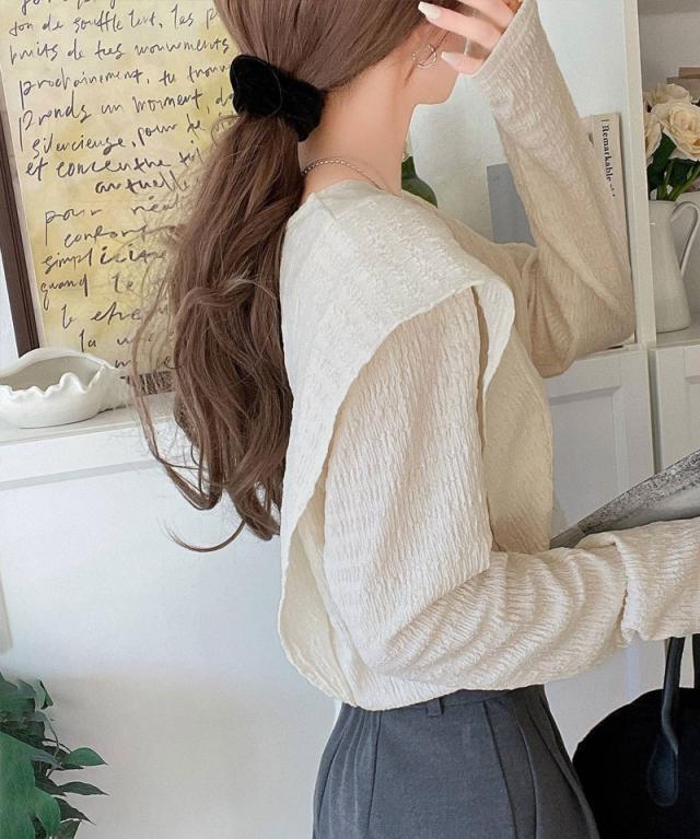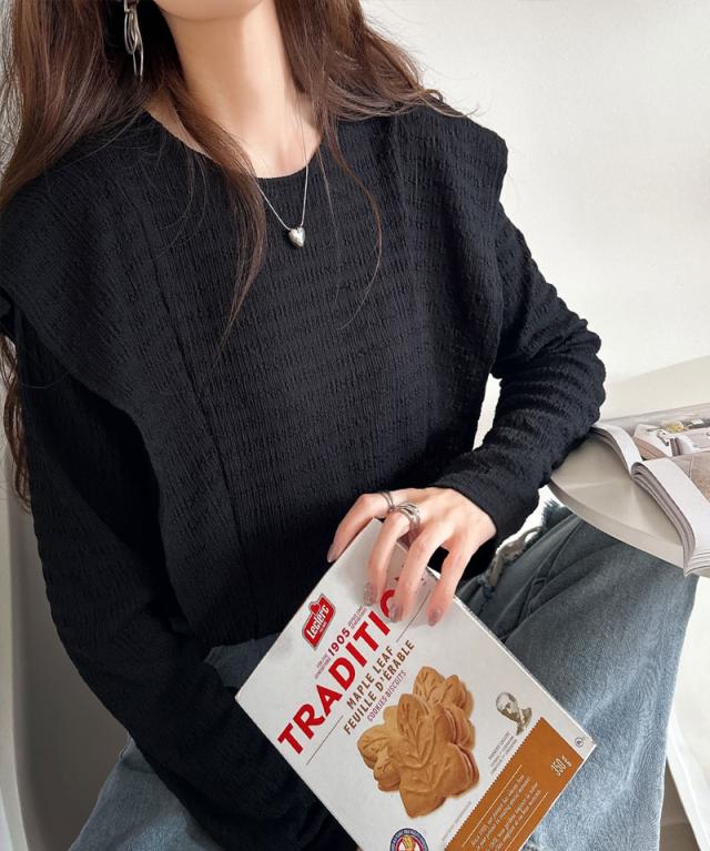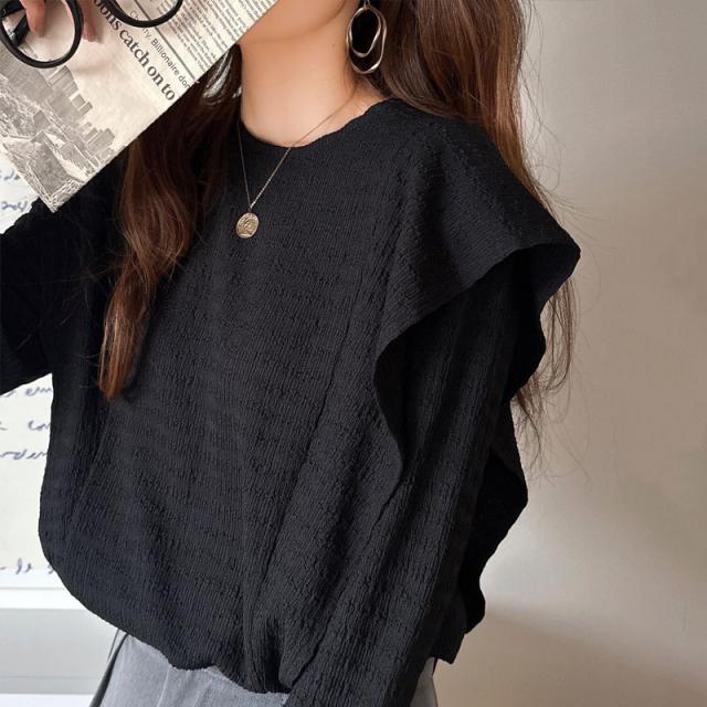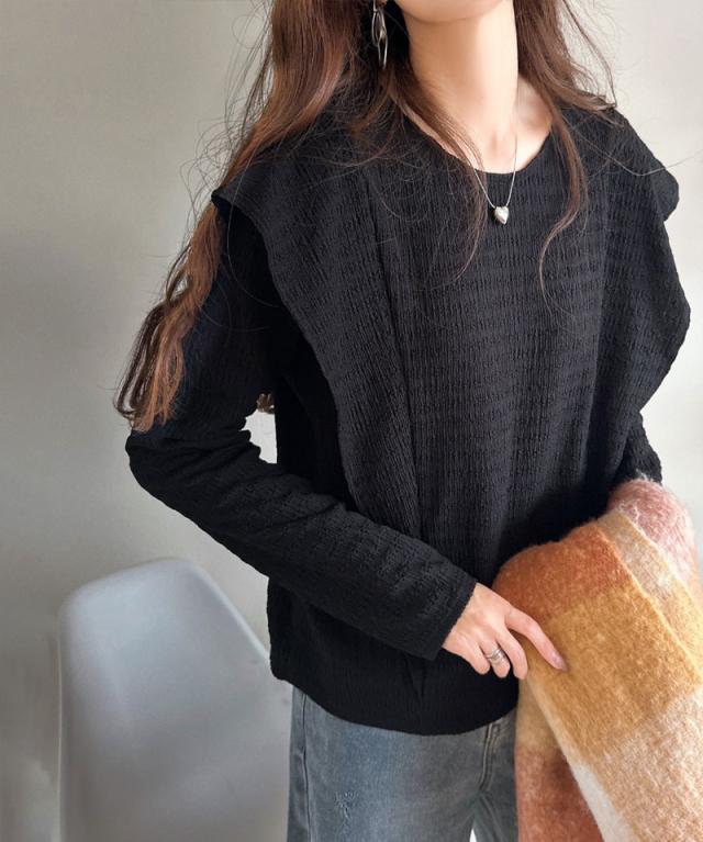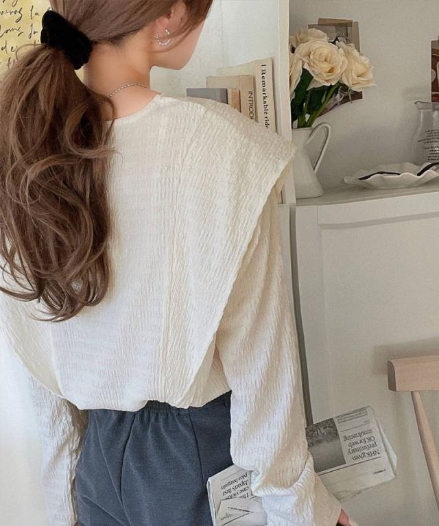 シンプルながらも、どこかワンポイントで華やかさを添えるフリルが魅力のトップス。