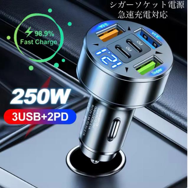 1 シガーソケット 急速充電器 3USB 2PD 250W 急速充電 カーチャージャー 4ポート LED USB 急速充電器 Type-C 車載充電器 スマホ充電器 コンパクトサイズ