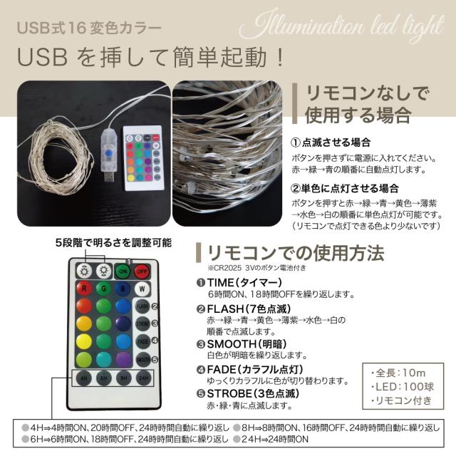 イルミネーション ライト 17変色カラー 【送料無料】 LED 100球 USB式 電池式 屋外 室内 ガーデンライト 正月 クリスマス 飾り レインボー リモコン付き カラフル レビュー 高評価