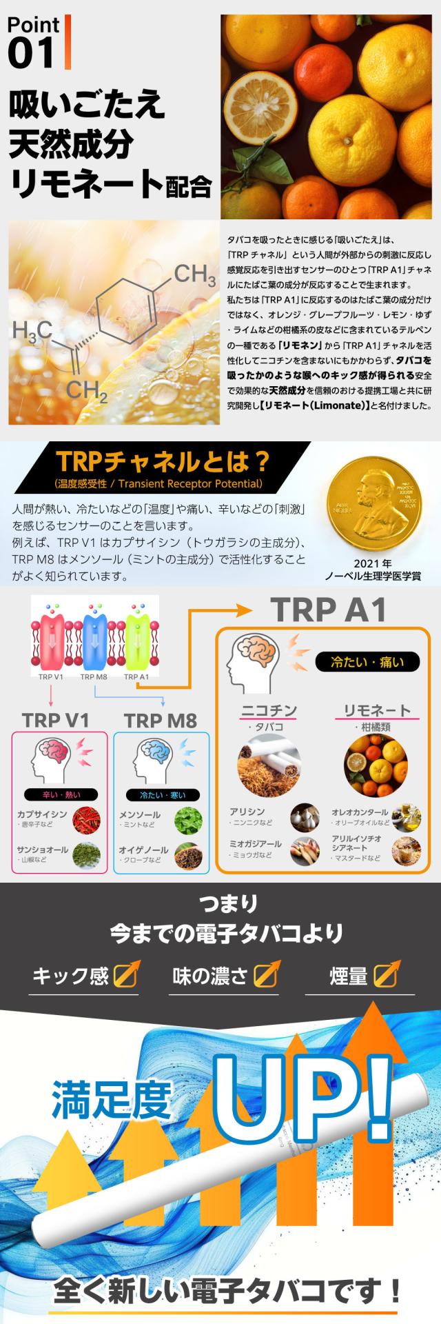 今までの電子タバコ(ベイプ・VAPE)製品は、刺激の強いメンソールや清涼剤で吸いごたえを表現していましたが、本製品はオレンジ・グレープフルーツ・レモン・ゆず・ライムなどの柑橘系の皮などに含まれているテルペンの一種、リモネン由来の安全な天然成分【 リモネート 】を配合し、加熱式タバコのようなリアルな吸いごたえ(キック感)を実現!