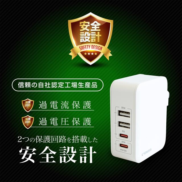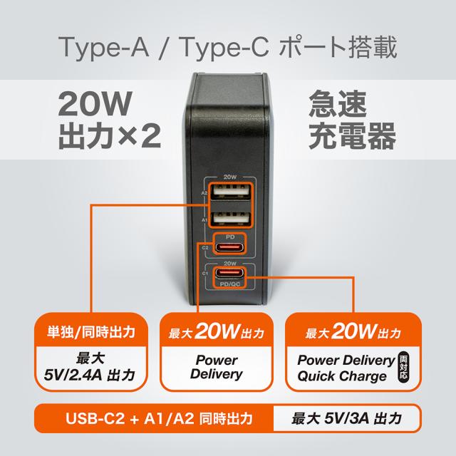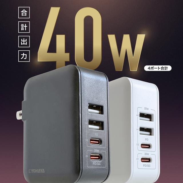 USB充電器 タイプC 急速 PD対応 QC対応 20W+20W 2回路搭載 合計40W 急速充電 ACアダプタ USB-A USB-C 4ポート Power Delivery Quick Charge iPhone 15 AQUOS sense8 Xperia 10 V Galaxy S23 OPPO Reno9 A arrows N 各種対応 JKPD40E4