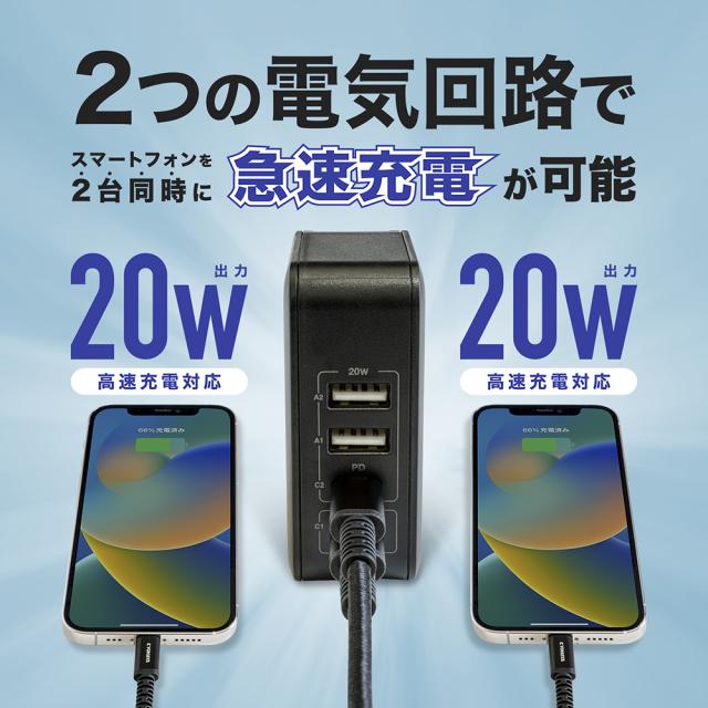 | 2つの電気回路で、スマホを同時に急速充電できるUSB充電器 |