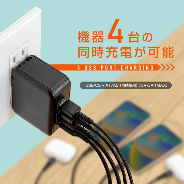 | USB CポートとUSB Aポートで最大4台同時に充電ができます。 ※USB-C2 + A1/A2 同時使用時は5V/3Aの出力になり、高速充電にはなりません。 |