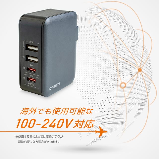| 100-240Vの入力電圧に対応しており、海外旅行にも最適です。 ※使用する国によって別途変換プラグが必要になる場合があります。 |