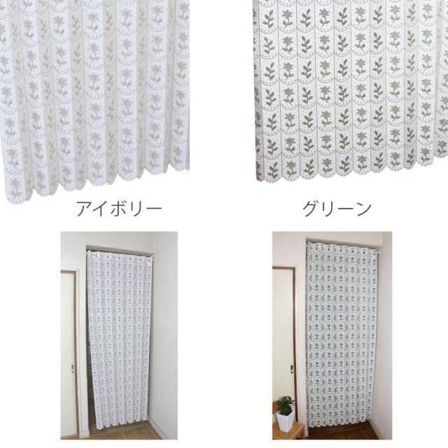 間仕切りや目隠しにおすすめな小さなリーフが特徴的なアコーディオンカーテンです。特殊な糸と染色方法でお部屋に馴染みやすいアイボリーと、模様替えにぴったりなグリーンに染めています。空間にアクセントをもたらしてくれますよ。