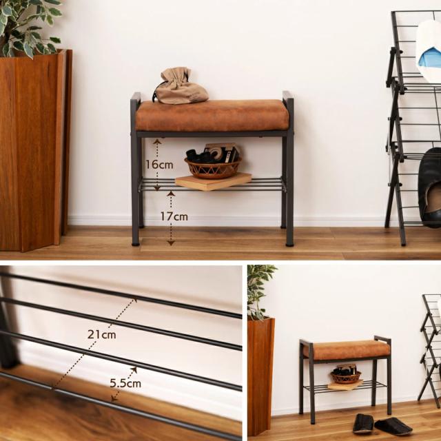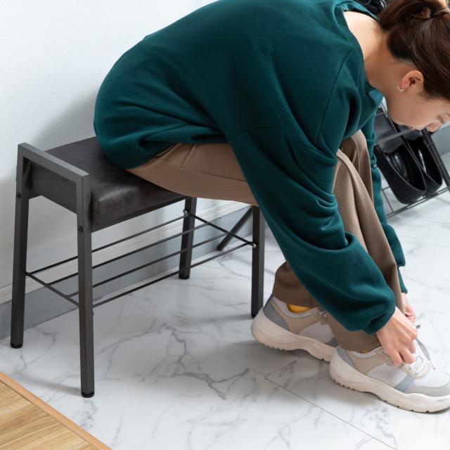 スツールの下部にはスチール素材のシンプルな棚板が付いています。お洒落な雑貨をディスプレイしたり、玄関先で仕様する際はスリッパなどを置いたり、便利とお洒落の両方を楽しめるアイテムです。