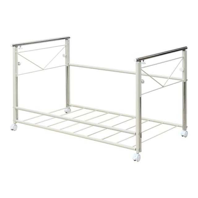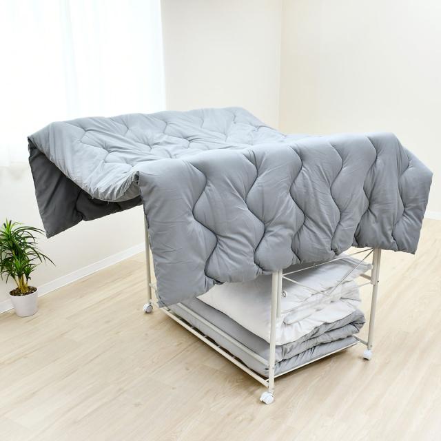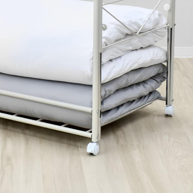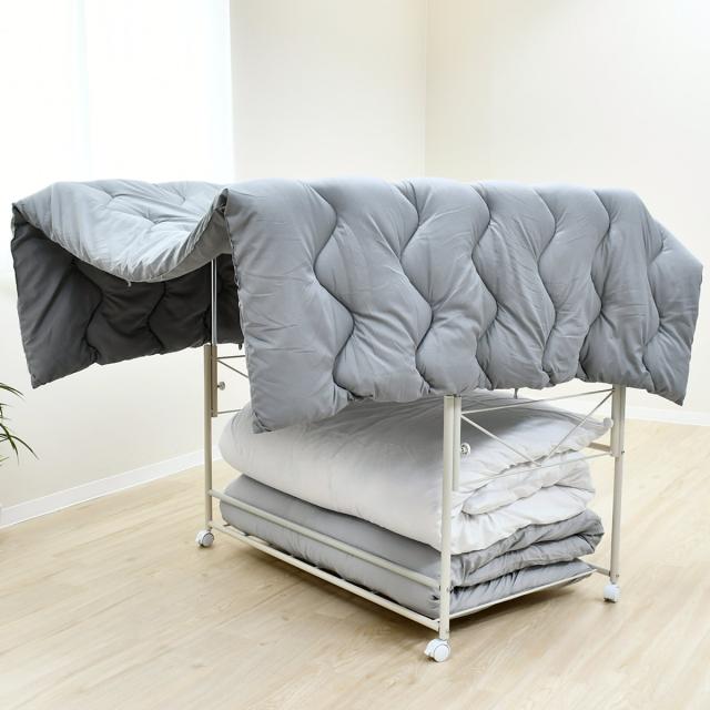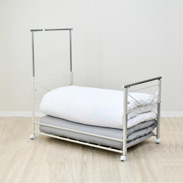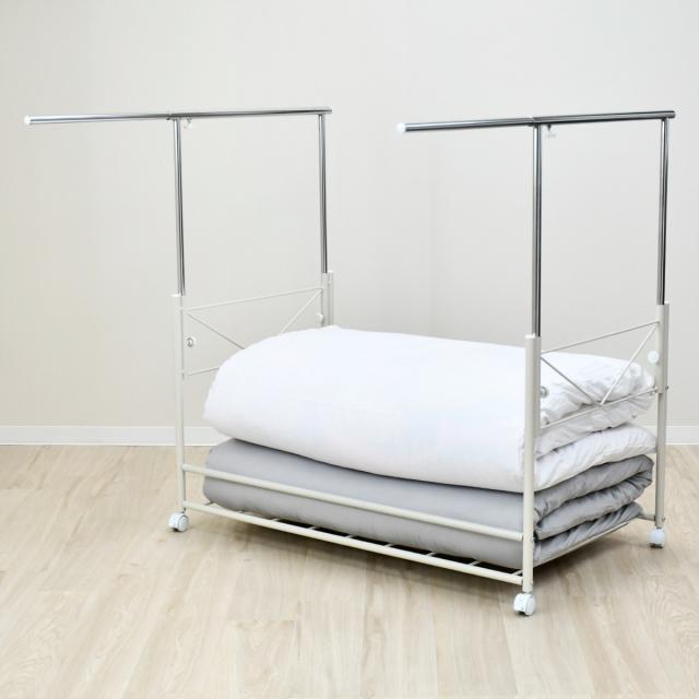 布団が干せる布団用収納ワゴンです。両サイドのポールが上に伸びることで、布団が干せる形状になります。布団を部屋干ししたいけど収納スペースがない、布団を干す際の移動が面倒、といったお悩みを解決します。