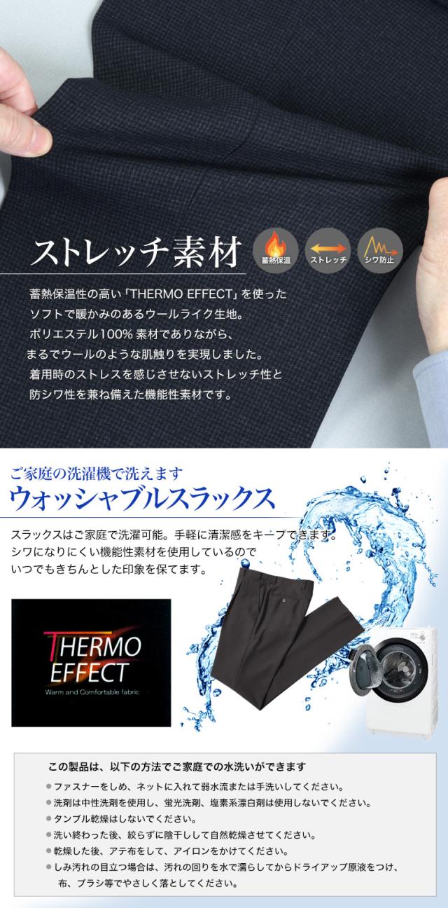 股下サイズ70・73・76cmから選ぶことができ、裾上げをする手間がなく、届いてすぐに着られます。蓄熱保温性が高く、暖かな着用環境を生み出す機能性素材「THERMO EFFECT」を使用したスラックス。ソフト暖かみのあるウールライク素材を使用しています。ストレッチ性があり、ストレスを感じず着用感も快適です。防シワ性に優れているので、ご家庭で洗えていつも清潔に保てます。お手入れ簡単イージーケアな商品です。