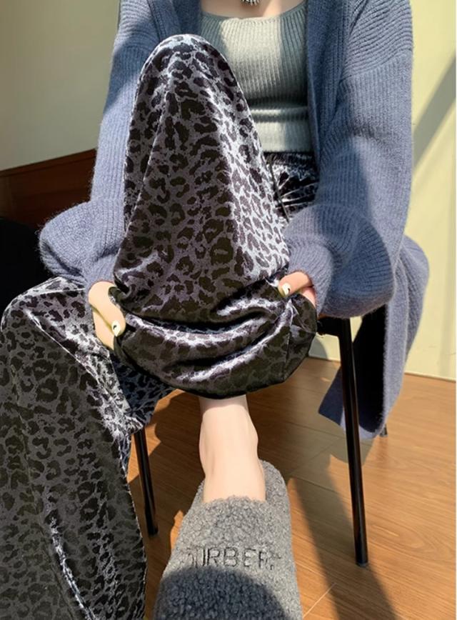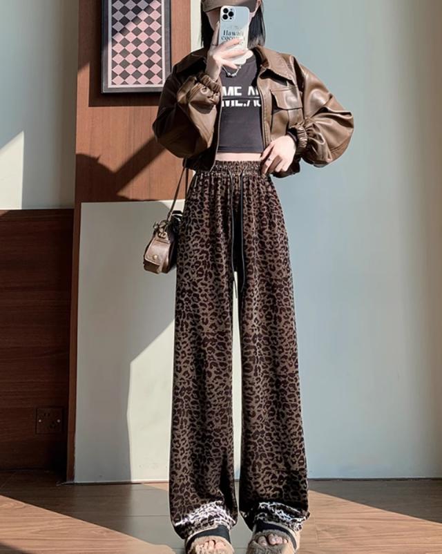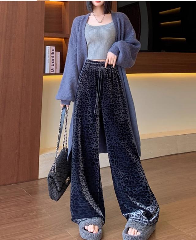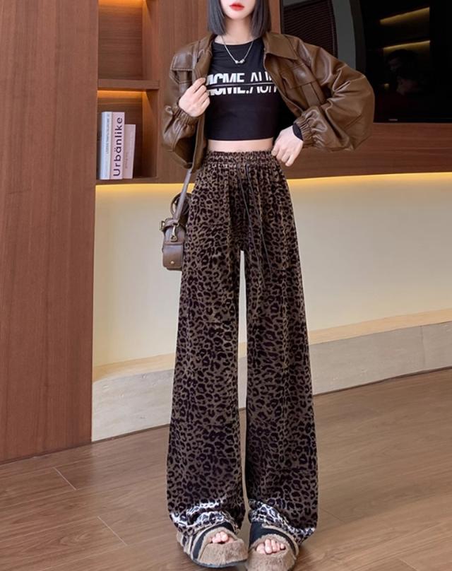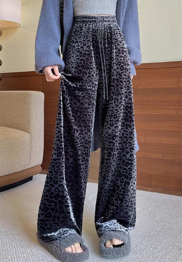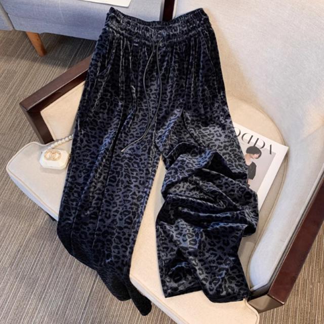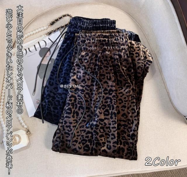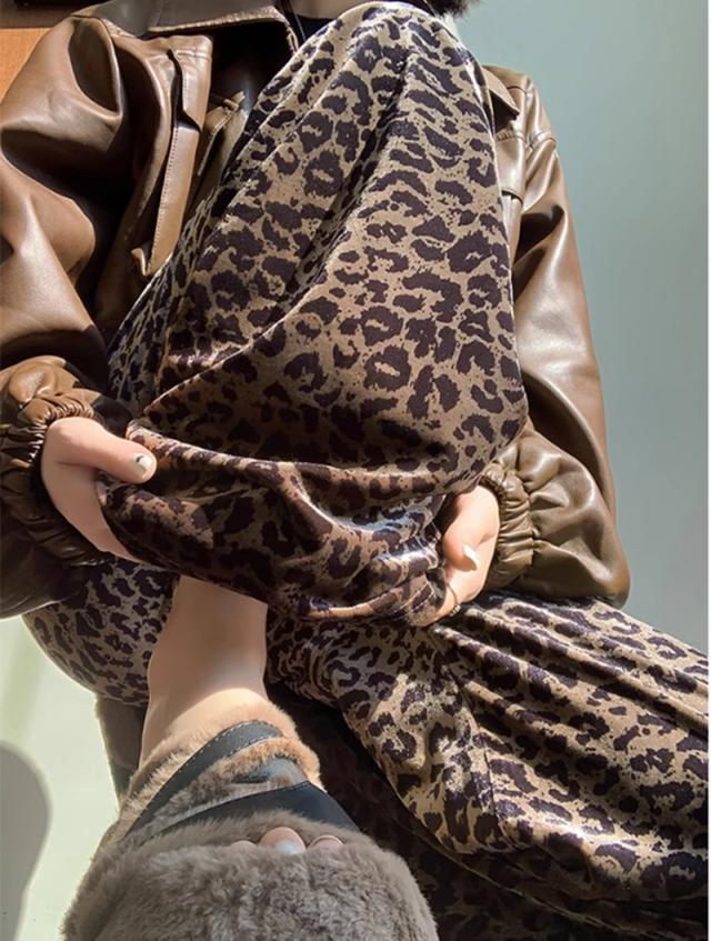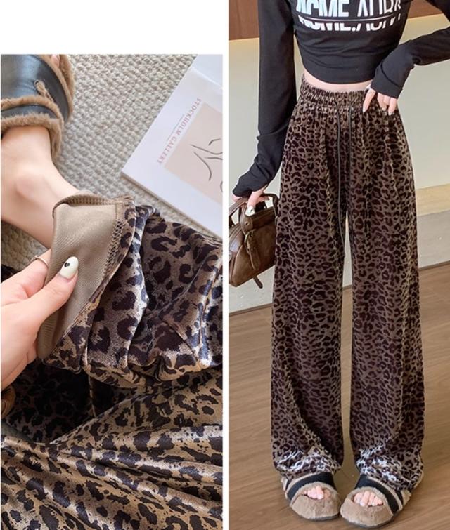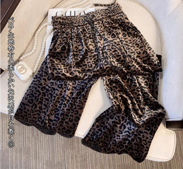送料無料 ベロア ヒョウ柄パンツ ワイドパンツ レディース レオパード ヒョウ柄 イージーパンツ ボトムス ロングパンツ 長ズボン ハイウエスト ウエストゴム ゆったり 体型カバー 美脚 カジュアル オシャレ 原宿風 ルームウエア モコモコ 秋 春 冬