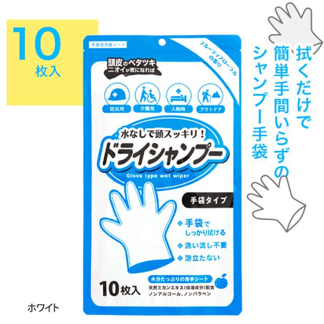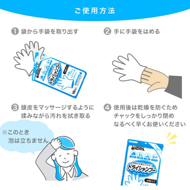 新作 【日本製】手袋型ドライシャンプー(10枚入り) シャンプー 手袋シャンプー 洗髪シート 防災 入院 介護 長期保存 水なし 低刺激 ノンアルコール パラベンフリー 災害 避難時 非常時 備蓄 ケガ エチケット