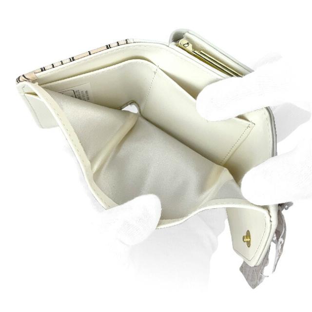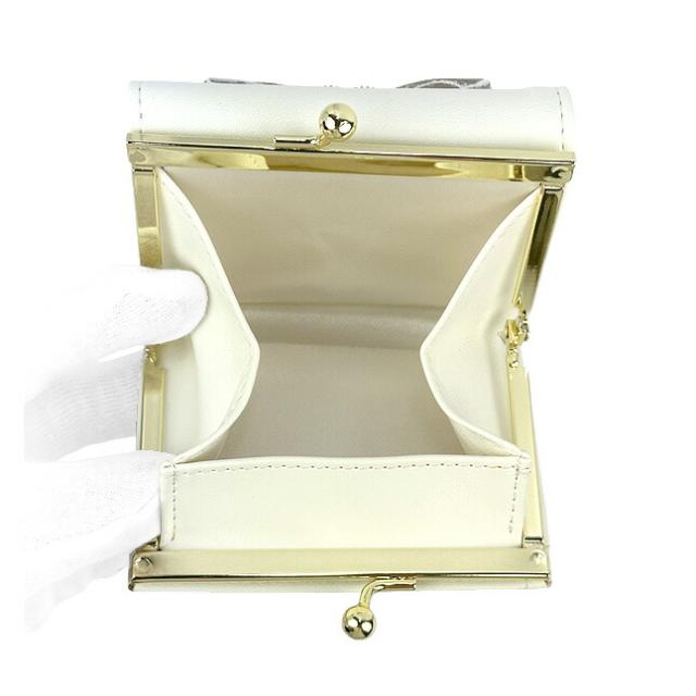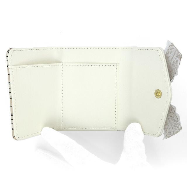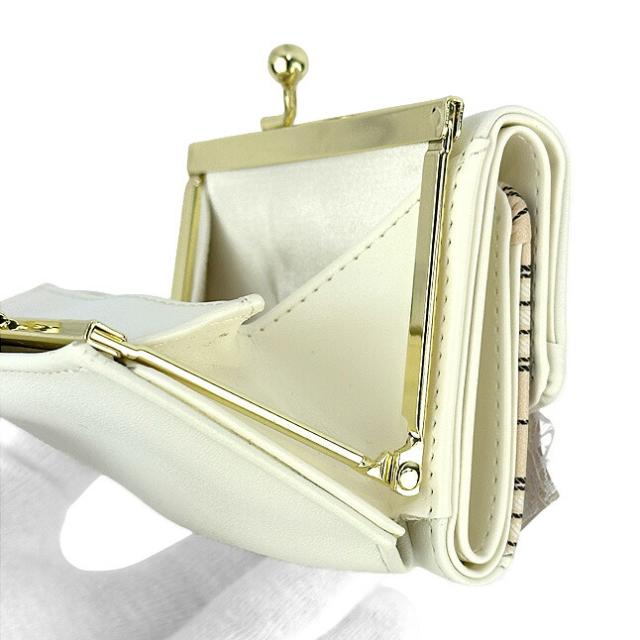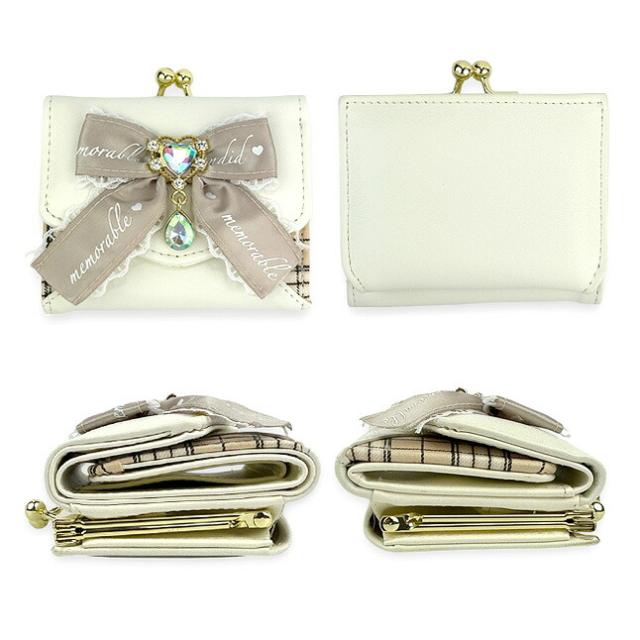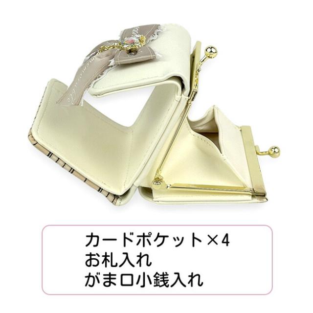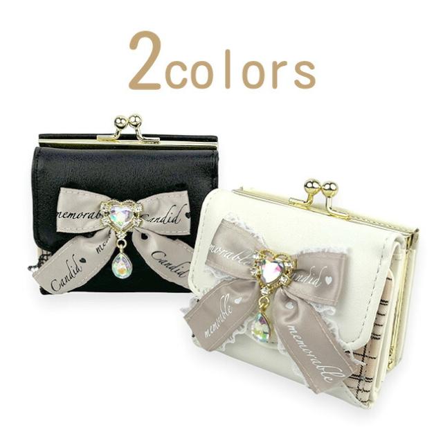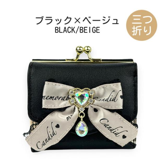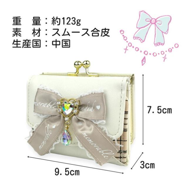 フロントの大きめリボンとハートドロップビジューがおしゃれながま口三つ折り財布。