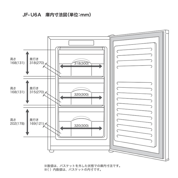 直冷式/スリムボディ/クリアバスケット ■定格内容積:60L ■外形寸法:幅480×奥行500×高さ840mm ■必要設置スペース:幅500×奥行600×高さ940mm ※設置条件により若干異なることがありますので、10mm程度余裕をとってください。 ■冷却方式:直冷式(霜取り・手動) ■質量(約):24.4kg ■年間消費電力量(50/60Hz):146kWh/年 ※記載は商品仕様の一部です。仕様説明不足等の理由での返品はできません。特に適合等は必ずご確認ください。