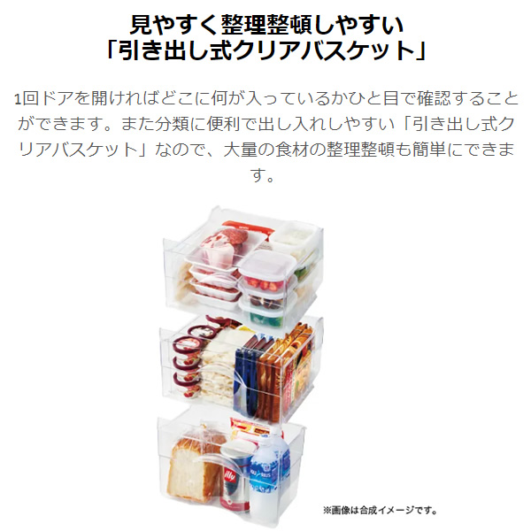 1回ドアを開ければどこに何が入っているかひと目で確認することができます。また分類に便利で出し入れしやすい「引き出し式クリアバスケット」なので、大量の食材の整理整頓も簡単にできます。