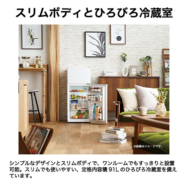 シンプルなデザインとスリムボディで、ワンルームでもすっきりと設置可能。スリムでも使いやすい、定格内容積91Lのひろびろ冷蔵室を備えています。
