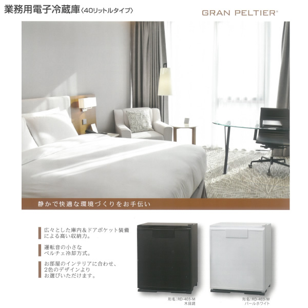 三菱電機 グラン・ペルチェ 業務用 冷蔵庫 40L【左開き】 シティホテルやリゾートホテルにも適した高級感のあるデザイン。ミニバーに適しています。 ■定格内容積:41L ■外形寸法(幅×奥行×高さ):450×455×550mm ■質量:16kg ■定格電圧・周波数:AC100V・50/60Hz ■定格消費電力:55/55W ■運転音:16dB ※1 ■冷却方式:電子冷却(ペルチェ方式) ■色:木目調 ■ドア開き向き:左開き ■ドア数:1ドア冷蔵庫 ※1: 運転音は日本産業規格(JIS C 9607)に規定の無響音室、扉前1mでの測定値です。 ※記載は商品仕様の一部です。仕様説明不足等の理由での返品はできません。特に適合等は必ずご確認ください。