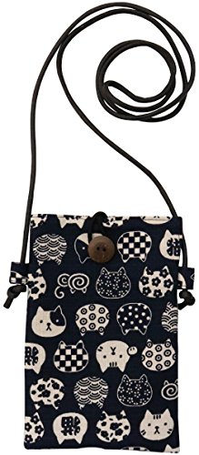 京佑(Kyoyu) 日本製 スマホ 携帯 ポシェット ポーチ ミニ ショルダー 斜めがけ にゃんこもん 猫 紺 11.5*17cm