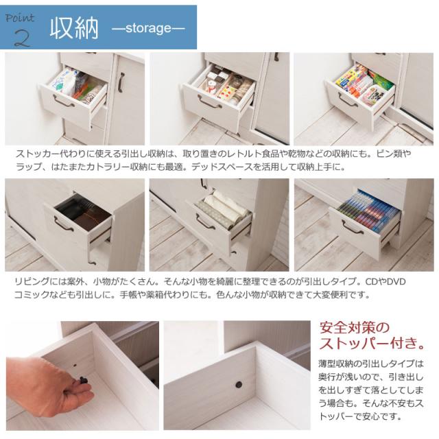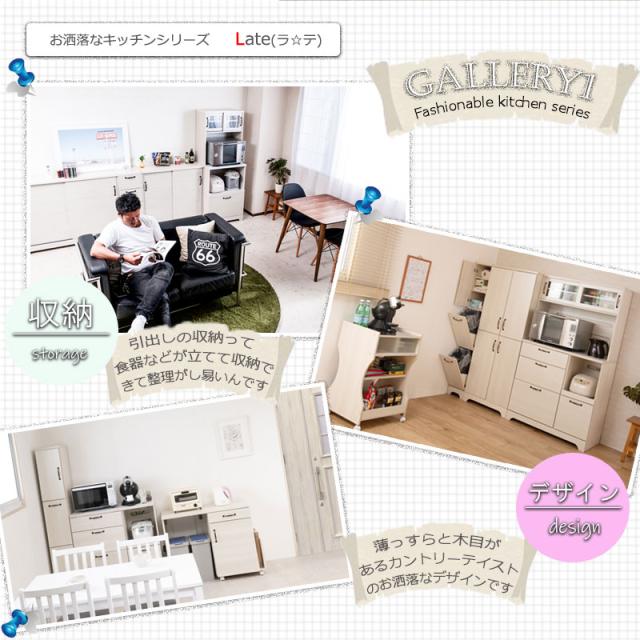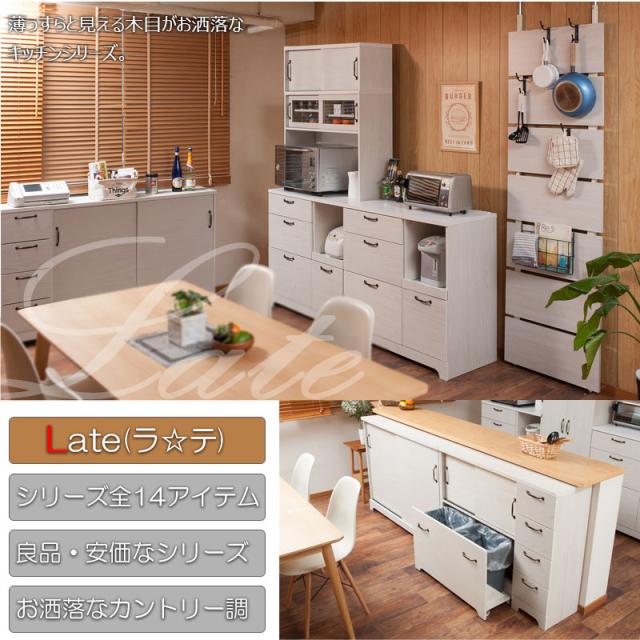 フレンチカントリーチックの可愛いカントリー風シリーズ。重厚感あるトランク取っ手、台輪部をアーチ状にくり抜くなど、シンプルなのに、存在感のある家具をイメージしたカントリーライン。扉は引戸式にし、狭い部屋でも使いやすく、限られた空間に収納機能を凝縮。カウンター下やリビングなど様々なシーンで活躍する薄型キャビネットは幅90、110にダストボックスまで取りそろえ、インテリア度アップ。ゴミ箱が入っているとは思えないダストカウンターは大好評!家電や食器収納に最適なキッチンボードもラインナップ。やさしい木目で一人暮らし、二人暮らしにも使いやすいサイズ感がうけています。