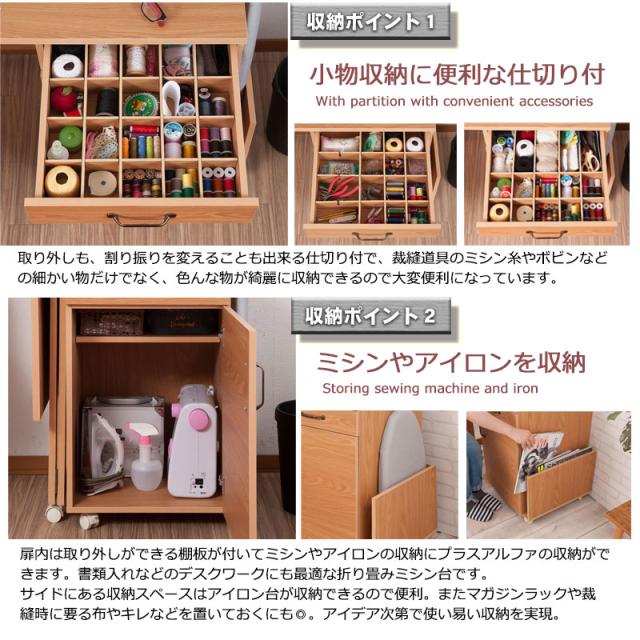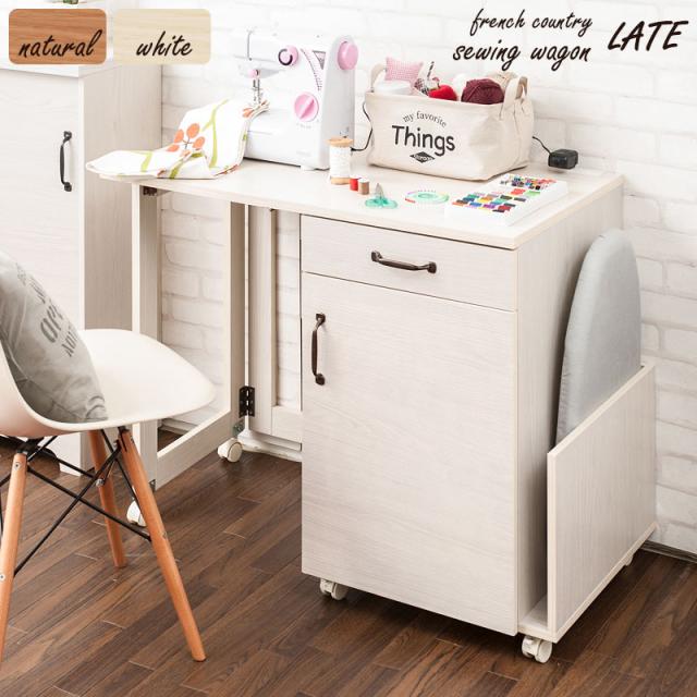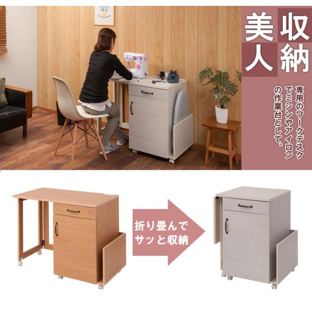 フレンチカントリーチックの可愛いカントリー風シリーズ。折り畳み式で使いやすいハウスキーピングワゴンが登場。ミシン台として、アイロン台として、ダイニングサイドにカウンターとして、デスクとしても様々なシーンで使える便利なワゴン。使わないときは天板をたたんで、使う時だけ出せる省スペース設計。コンセントも付属し、ミシンやアイロンを使うのに最適な天板奥に配備。引出し内に組み換えや取り外しができる万能仕切り板が付属。扉内に棚板が付いて何かと収納に便利。サイドラックにはアイロン台や生地をストックなどあらゆるうれしい機能がふんだんに搭載。使って分かる機能美をぜひ実感してください。やさしい木目で一人暮らし、二人暮らしにも使いやすいサイズ感がうけています。