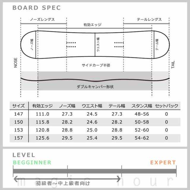 足下付近がキャンバー、センターはロッカーになった2つの乗り味を楽しめるWキャンバー形状。 脚力に自身のない方でも乗りやすい軽量&ソフトフレックスで快適楽々ターン♪ひっかかりが少なくトリックなども仕掛けやすいので新しい技に挑戦しやすい! ロッカーの楽しさと、しっかり踏みこむことでキレのあるカービングもできるのでオールラウンドで楽しめる♪FUNな乗り心地でグラトリにもおすすめ! 形状:ダブルキャンバー/ ツインチップ, SW構造 |