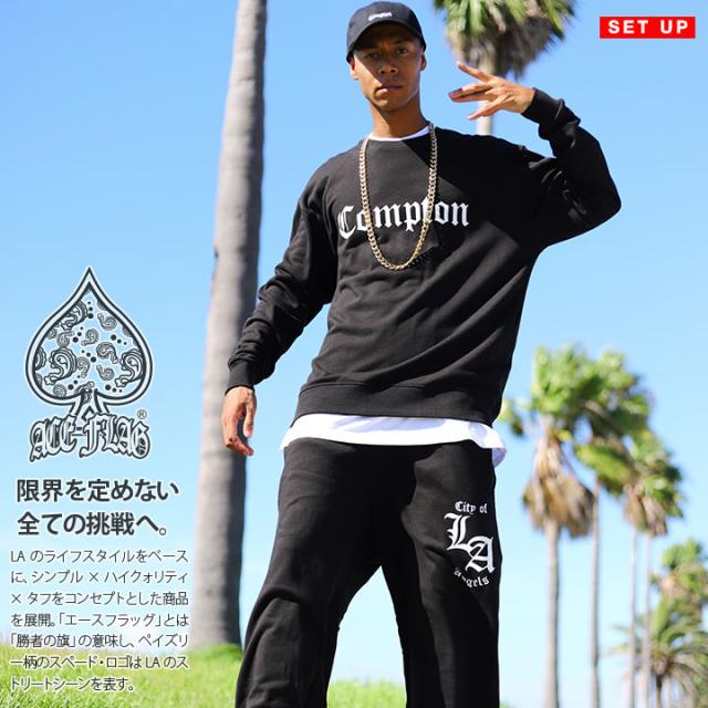 ACE FLAG 上下セット 長袖 ブランド スケボー メンズ 春秋冬用 黒 大きいサイズ エースフラッグ セットアップ トレーナ裏パイル スウェットパンツ Compton コンプトン ビッグシルエット b系 ヒップホップ ファッション ダンス ストリート系 ハイ 新作 AF-SE-SW-082