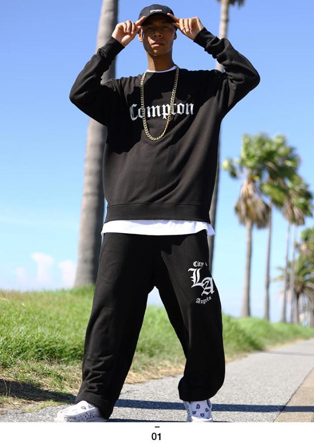 N.W.A.を輩出し、Straight Outta Comptonの舞台としても知られている「Compton」をドロップしたトレーナーとLos Angelesの頭文字にあたる「LA」をドロップしたスウェットロングパンツの上下セット。