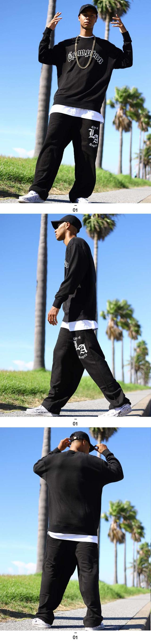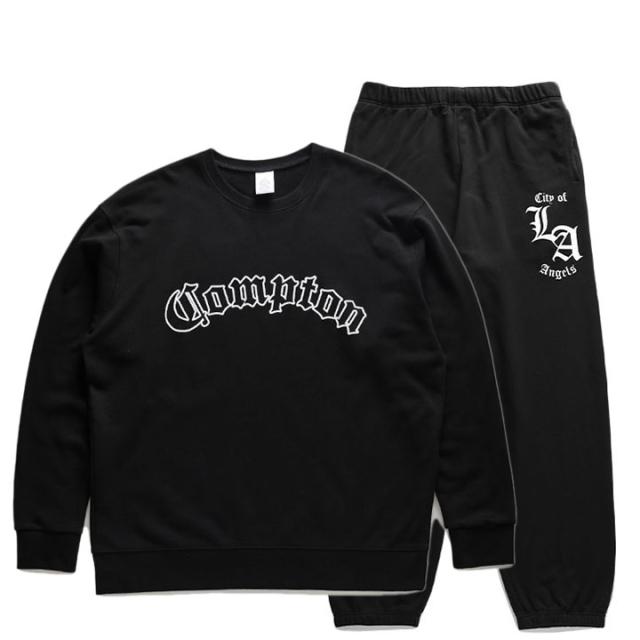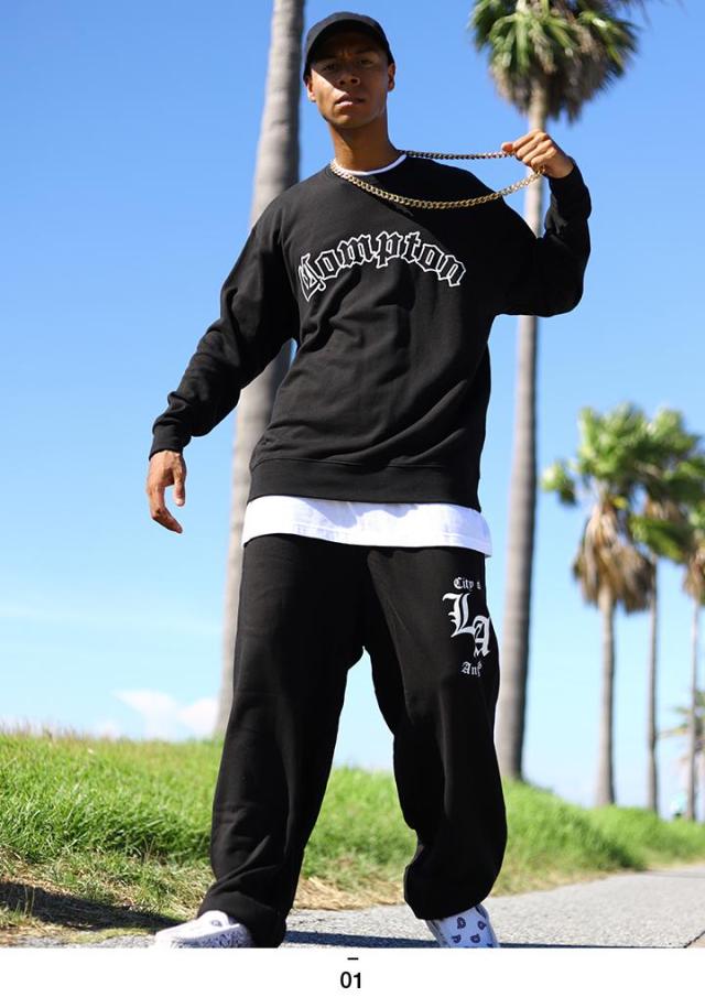 N.W.A.を輩出し、Straight Outta Comptonの舞台としても知られている「Compton」をドロップしたトレーナーとLos Angelesの頭文字にあたる「LA」をドロップしたスウェットロングパンツの上下セット。