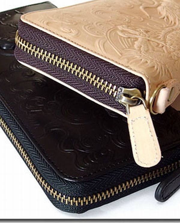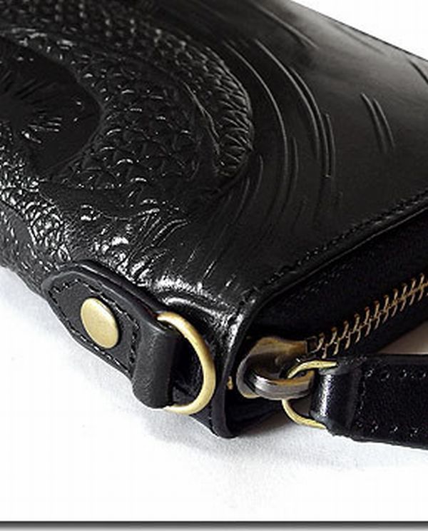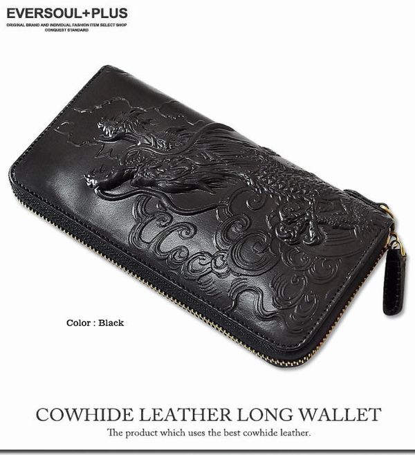 ★特殊なエンボス加工で立体感のあるドラゴン(龍)が迫力満点の本革レザー長財布!開け閉めし易いラウンドファスナータイプのデザインに収納も豊富で使い勝手も抜群!Dカン付きでウォレットチェーンにも対応します!本革なので使い込む程に経年変化で味が出て来る長財布です!