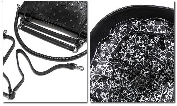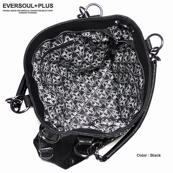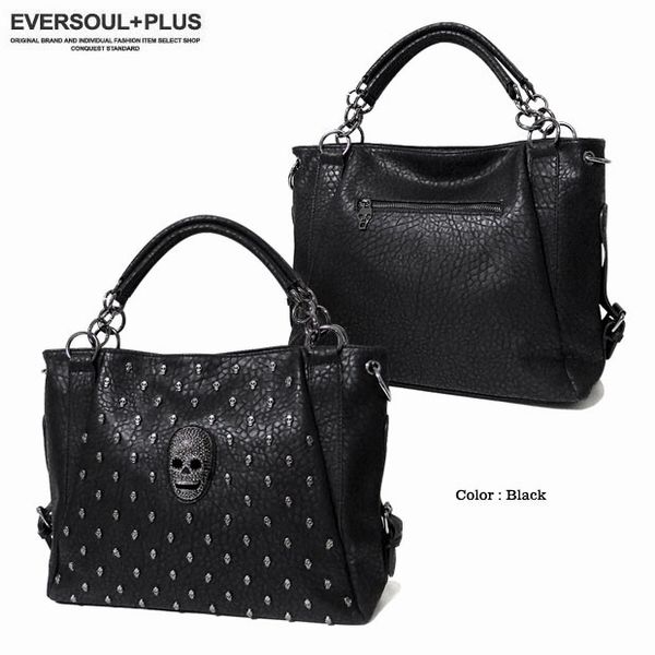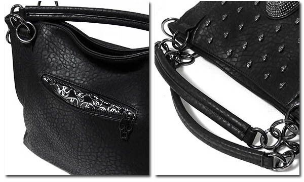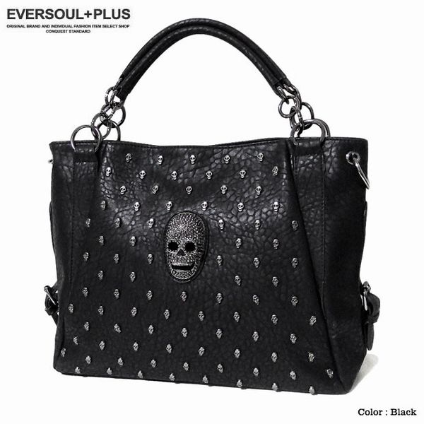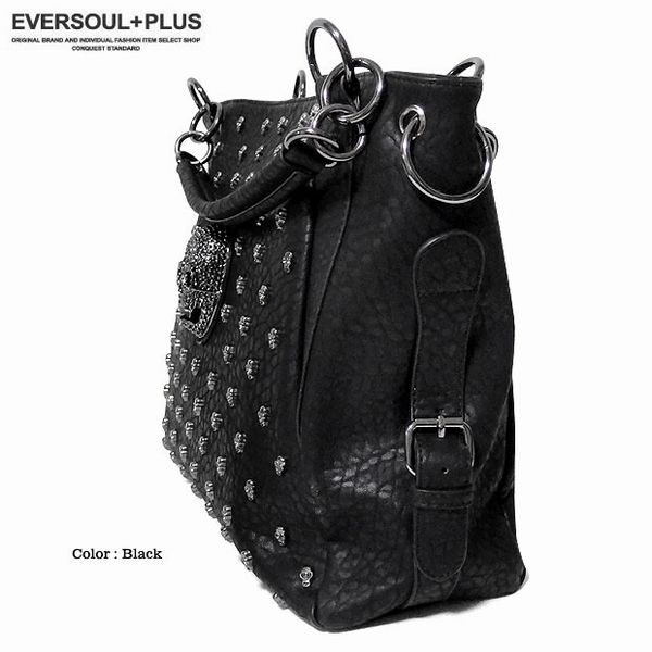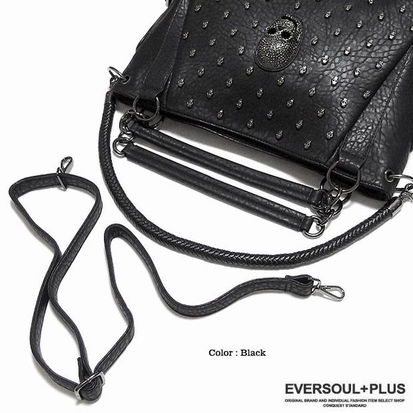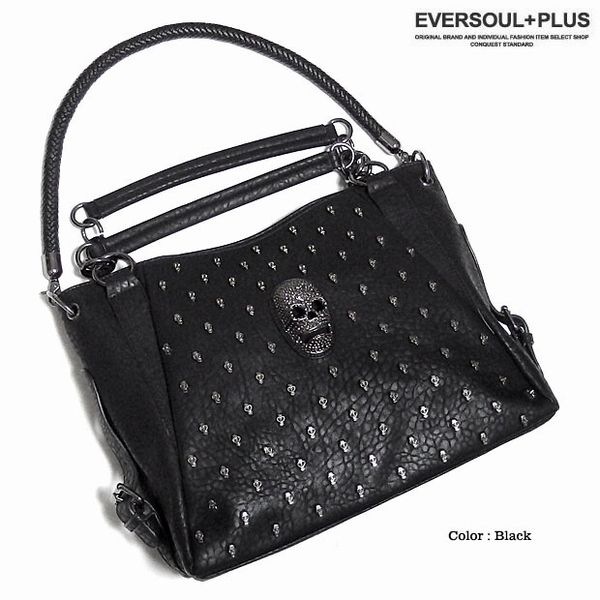 ★多数のスカルスタッズ打ちとスカルのデコレーションがラグジュアリーなフェイクレザー2WAYハンドバッグ!脱着可能な2種類のベルト付属でショルダーバッグとしても使える2WAYバッグです!脱着ベルトは長さとデザインの異なる2種類でその日の気分でチョイス!もちろん収納力も充分の大きめサイズでユニセックスで使える2WAYバッグです!