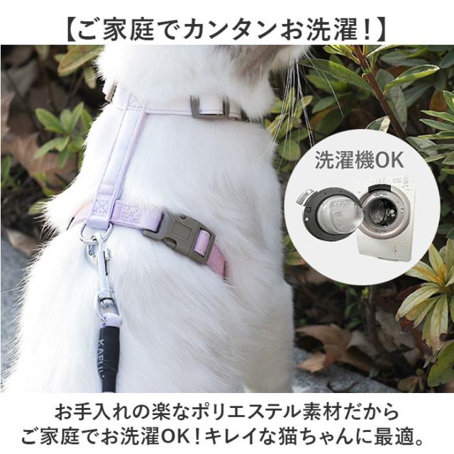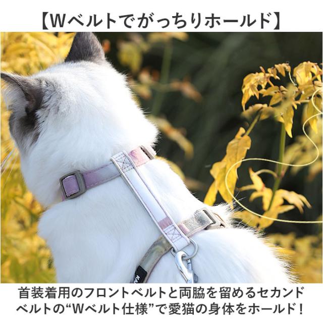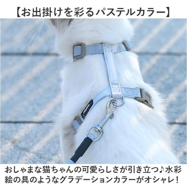 | 商品説明 | 【猫ちゃんとのお出掛けや通院に!】 ・しなやかな猫ちゃんの身体に優しくフィット!「キャット用ハーネス&リードセット」が新登場! 【Wベルトでがっちりホールド】 ・首装着用のフロントベルトと両脇を留めるセカンドベルトの“Wベルト仕様”で愛猫の身体をホールド! 【ハーネスの装着は簡単3ステップ】 1.左右に調整アジャスターが付いた、リング状のフロントベルトを首輪のように猫ちゃんの首に掛ける。 2.フロントベルトと、予めバックルを外しておいたセカンドベルトの間の四角いすき間に右足を通してあげる。 3.セカンドベルトのバックル先端部分を左脇でくぐらせ、背中の左側でバックルをパチンッと留めて装着完了! 【アジャスターでサイズ調節自在】 2本のベルトはしなやかな猫ちゃんの身体からハーネスが外れないよう、アジャスターで調節可能。 【ソフトな感触が優しい専用リード】 ・万が一お散歩中に身体に巻き付いても安心!ソフトなスポンジを生地で包みこんだリードが付属。 【リードの接続はワンタッチ!】 ・セカンドベルト背中部分に縫い付けたDカン金具に、リードのナスカンフックをスムーズに接続可能。 【ねじれを防いでストレスフリー】 ・リードのジョイント部分が360度回転するので、お散歩中のリードのねじれ、気にならない♪ 【ネコちゃんに優しいつくり】 ・リードが引っ張る力を胸や肩で受け止める「工字型」ハーネスなので、首輪より負担が少なく安心。 【ご家庭でカンタンお洗濯!】 ・お手入れの楽なポリエステル素材だからご家庭でお洗濯OK!キレイ好きな猫ちゃんに最適。 【小型犬にもオススメなサイズ感】 ・「S〜Mサイズ」の2サイズ展開で、猫ちゃんだけでなく小型のワンちゃんも着けられるサイズ感。 ・※超小型犬から、胴回り44cm程度までの小型犬に最適なサイズ感です。 【お散歩中の不意な飛び出し防止】 ・普段おうちの中で過ごす猫ちゃんを公園でのびのびお散歩させたい時、動物病院への通院時に大活躍! 【お出掛けを彩るパステルカラー】 ・おしゃまな猫ちゃんの可愛らしさが引き立つ♪水彩絵の具のようなグラデーションカラーがオシャレ! |