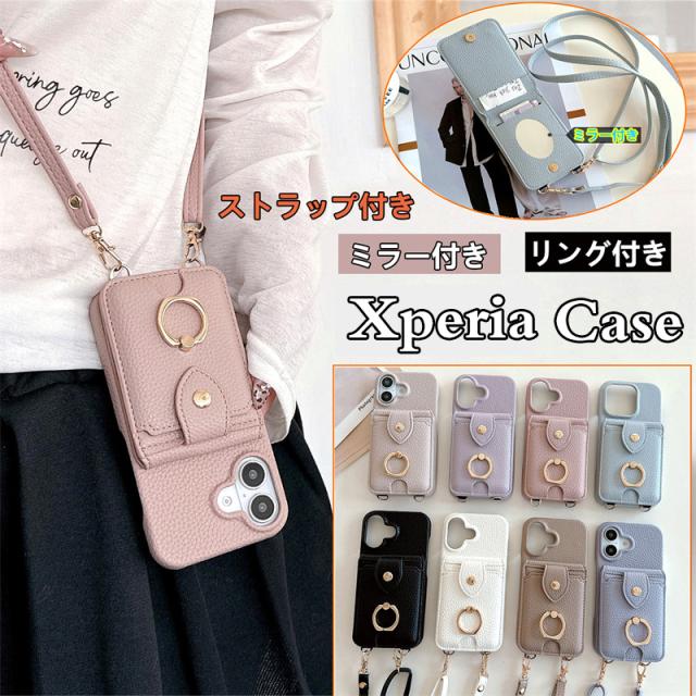 Xperia 10VI SOG14ケース ショルダー ミラー付き ストラップ付き Xperia 1VI SOG13ケース エクスペリア 1 10 VII SOG15 10V 5V 1V 5IV 10 1 IV 1 5 10 III カバー 耐衝撃 レザー リング付き スタンド エクスペリア 10viケース スマホショルダー 大人可愛い おしゃれ 鏡