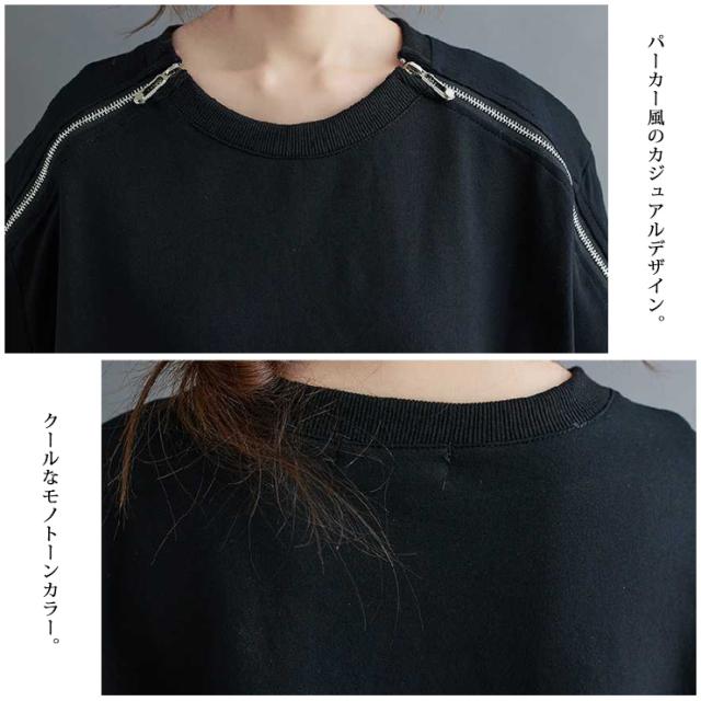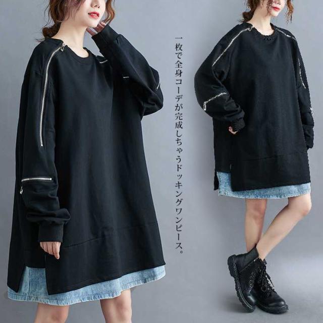 ★☆大きいサイズ レディース 重ね着風トップス シャツレイヤード 長袖 スウェット プルオーバー ジップ 秋 春 LL 3L 4L 5L 6L ブラック☆★