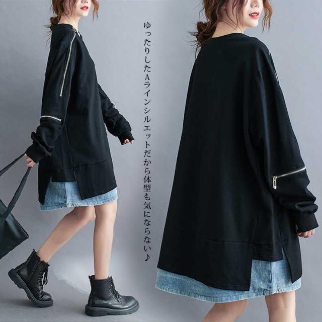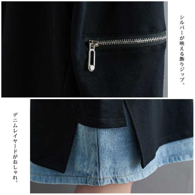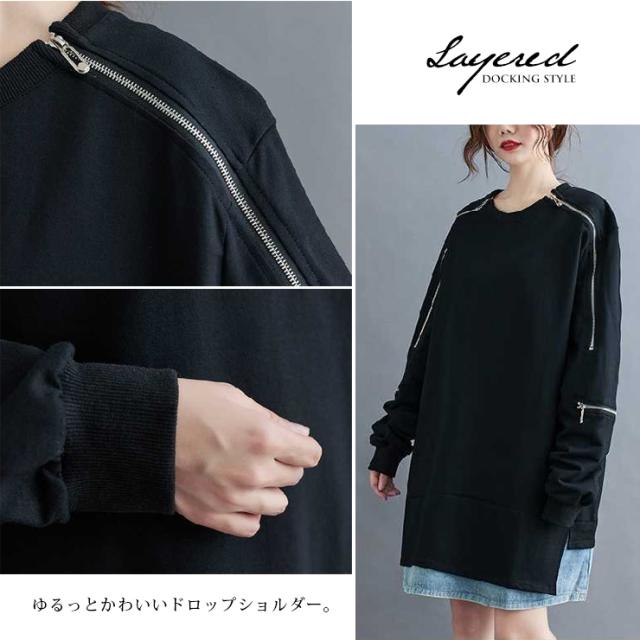 大きいサイズ レディース 重ね着風トップス シャツレイヤード 長袖 スウェット プルオーバー ジップ 秋 春 (617862)