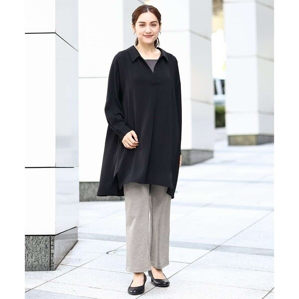 シャツチュニックなど着丈が長めのトップスで合わせても重たくならず、すっきり着られます。