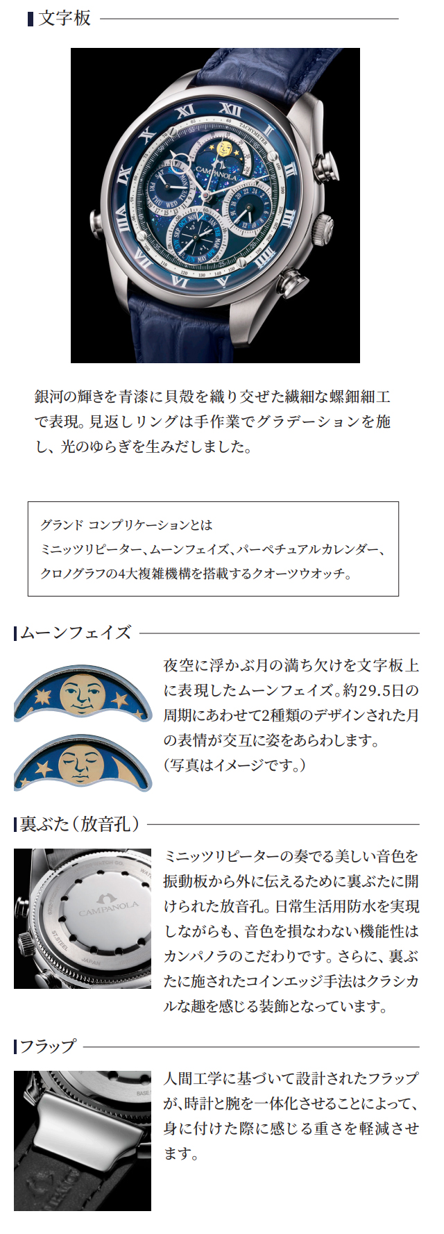 | 仕様 | 日常生活用防水 ミニッツリピーター機能 ムーンフェイズ機能 パーペチュアルカレンダー クロノグラフ デイ&デイト表示 日付早修正機能 24時間表示機能 ±20秒/月 文字板:漆塗り+螺鈿 日本製 |