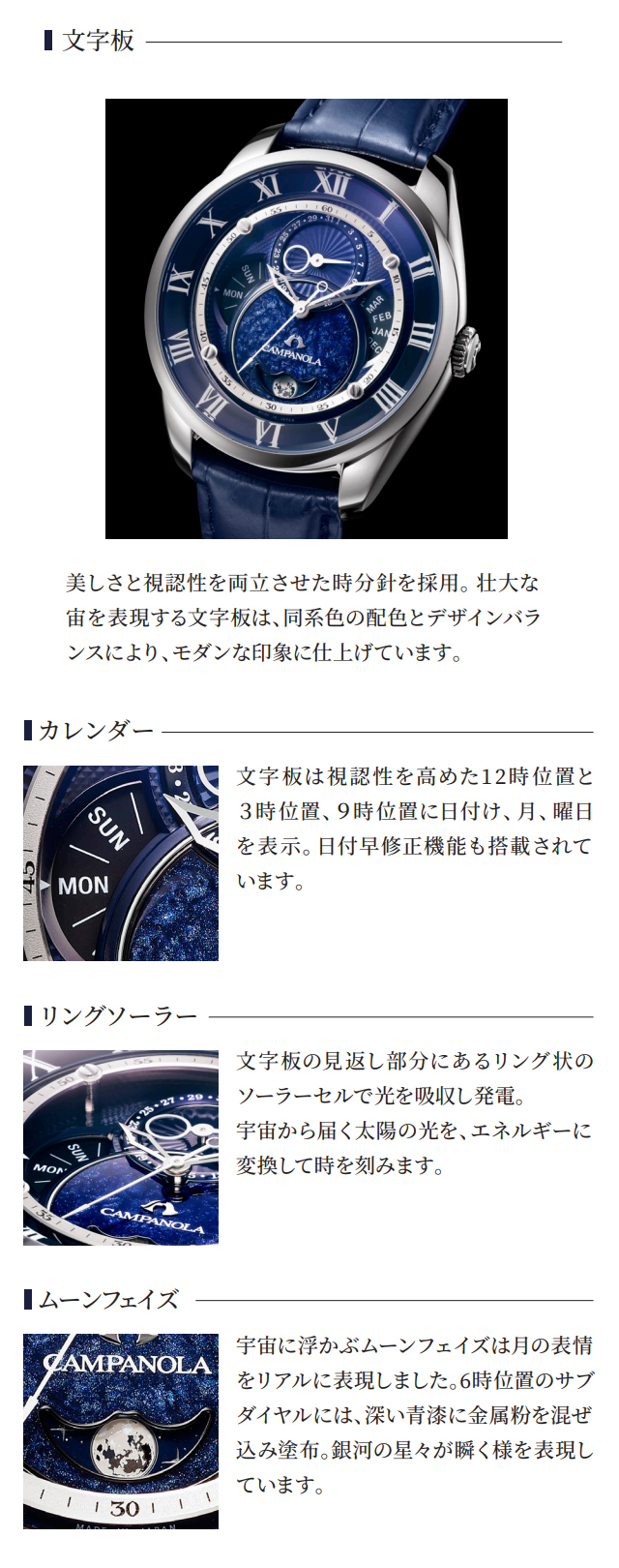 | 仕様 | 日常生活用防水 ムーンフェイズ機能 トリプルカレンダー(曜日、月、針による日表示) 日付早修正機能 充電警告機能 過充電防止機能 クイックスタート機能 光発電フル充電時約6ヶ月可動 エコマーク商品(環境保全型商品) 精度:±15秒/月 文字板:電気鋳造+漆塗り 日本製 |