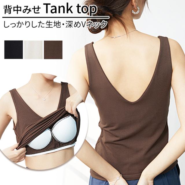 カップ付き タンクトップ ブラトップ ブラタンク レディース キレイに見せる 深めVネック 背中見せ しっかりした生地 シンプル 黒 白 茶 M L LL rr-021