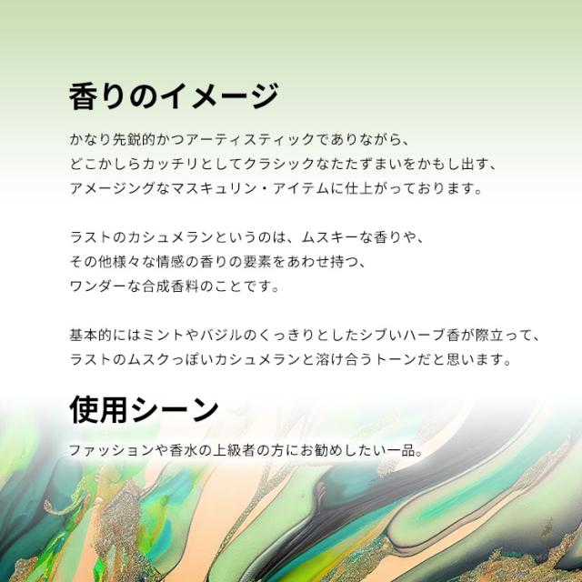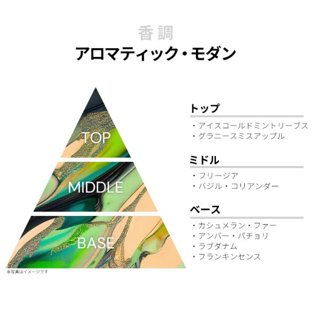 グリーン・アップル、リモネン、シトラル、リナロール、ミントなどが、シックなフルーティー・ハーバルを香り立たせるトップから、
