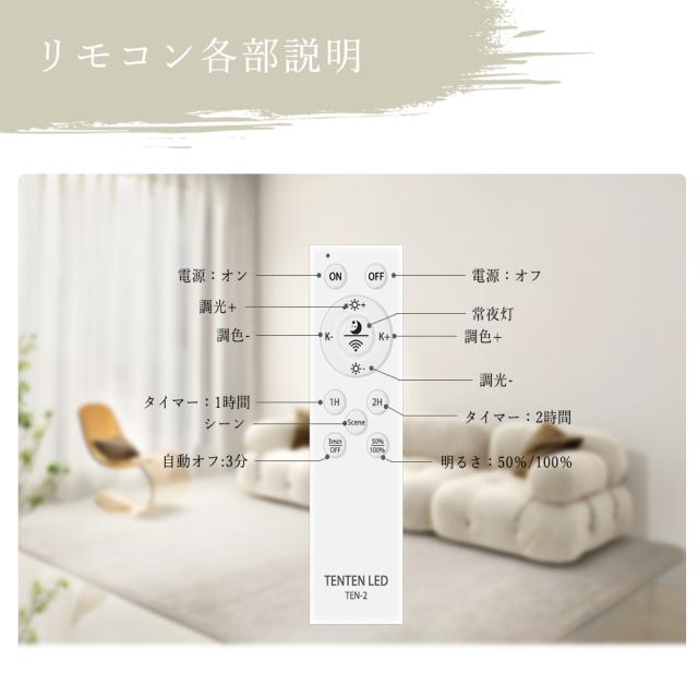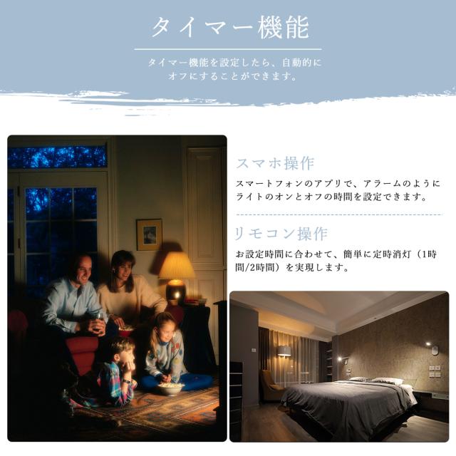 - 定時で照明のオン・オフを設定でき、自然の日の出や日の入りをシミュレーションします。リモコンで1時間または2時間のタイマー設定ができ、スマートフォンはアラームのように自由にタイマーを設定できます。