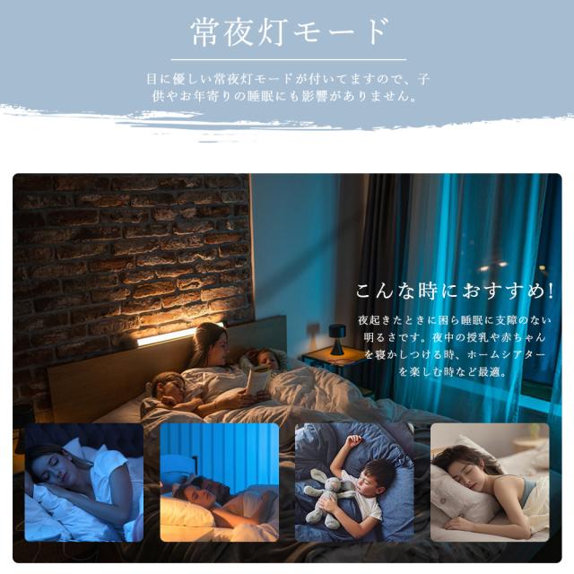 - このモードは、主に夜間の使用を想定しており、睡眠を妨げずに部屋をわずかに照らすことができます。トイレや廊下など、夜中に移動する際に安全を確保し、明るすぎない柔らかな光で安心感を提供します。また、子供の寝室に適しており、暗闇の中でも不安を軽減する効果があります。