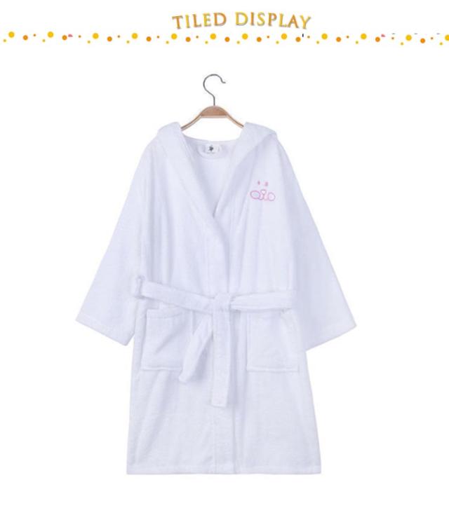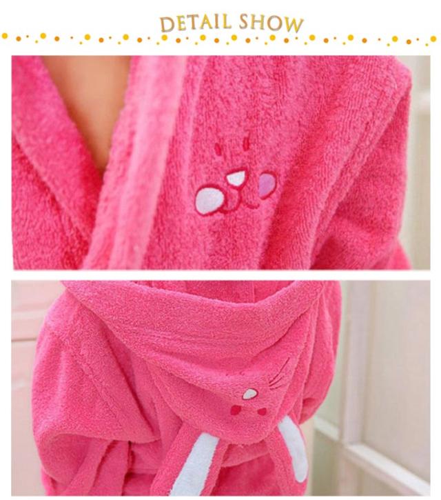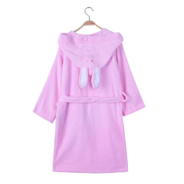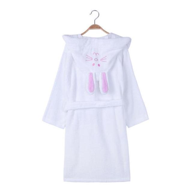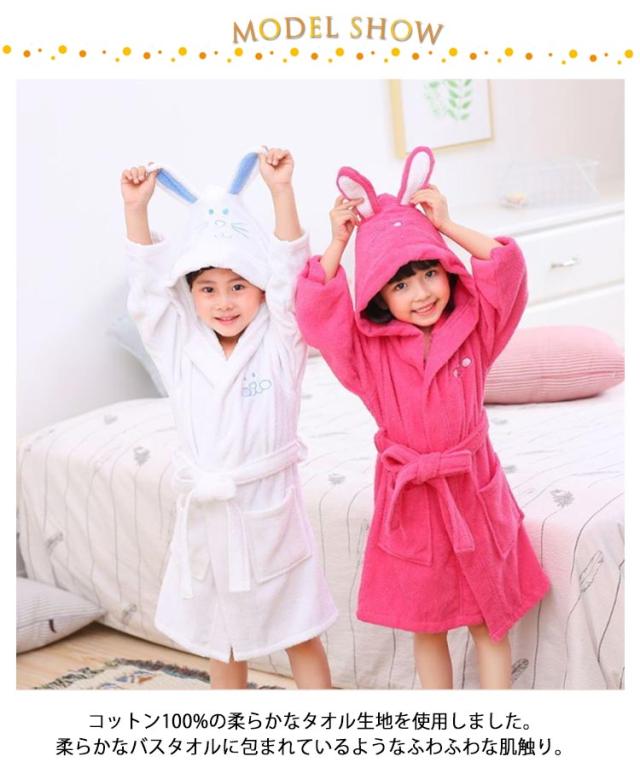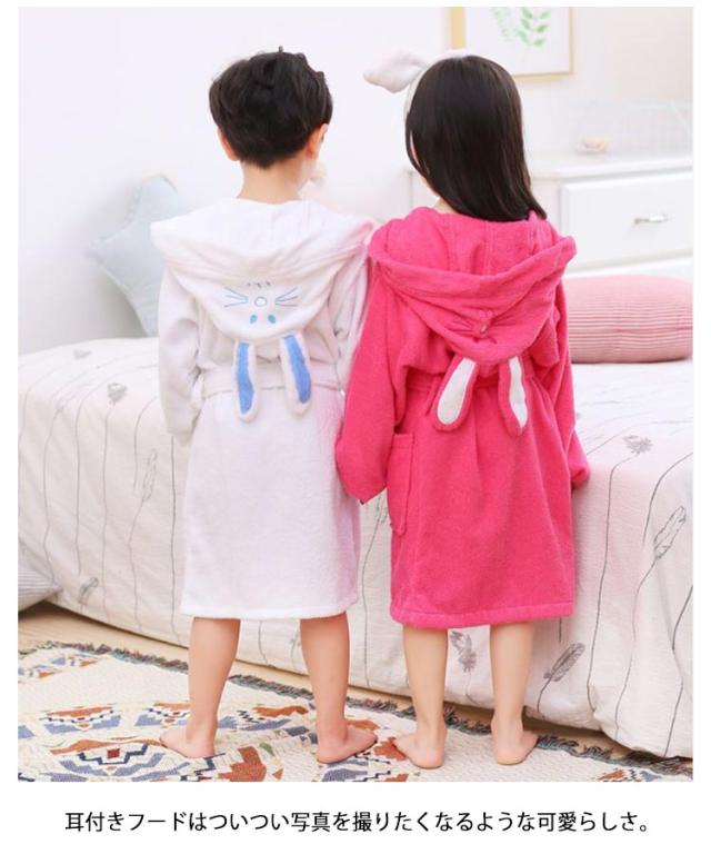 | 子供用兎の耳付きのバスローブ。【100%綿】【90cm-165cm】 コットン100%の柔らかなタオル生地を使用しました。柔らかなバスタオルに包まれているようなふわふわな肌触り。 耳付きフードはついつい写真を撮りたくなるような可愛らしさ。 両サイドには小物やおもちゃの持ち運びに便利なポケット付きです。 | |