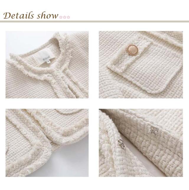 | 立体感のある織地が表情豊かなツイード生地のノーカーラージャケット 襟ぐりから前立て、裾、袖口、ポケット口を裁ち切りのフリンジで縁取り。 胸ポケットや袖口にはきらりと光る金属ボタンをあしらって、ディテールまでぬかりなく高見えします。 フリンジディティールがフェミニンな雰囲気をプラス。 上品で女性らしい優しいイメージのアイテムです。 | |