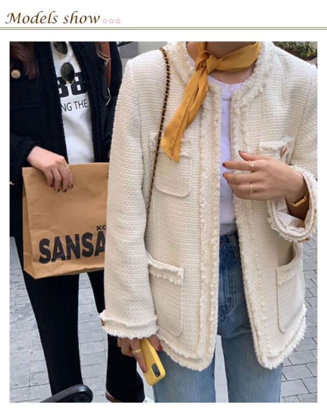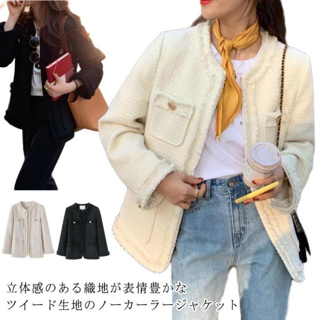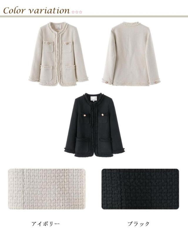 レディース ツイードジャケット 秋 ツイード ノーカラージャケット ノーカラー スーツ ノーカラー 春秋 上品 ノーカラー きれいめ 無地 アウター 春 ジャケット フリンジ アウター ミモレコート フォーマル 体型カバー 着?せ